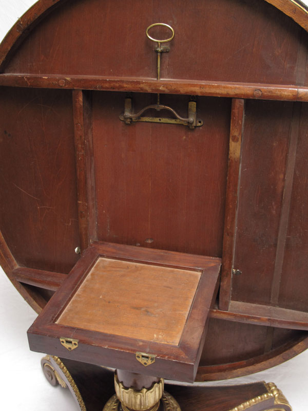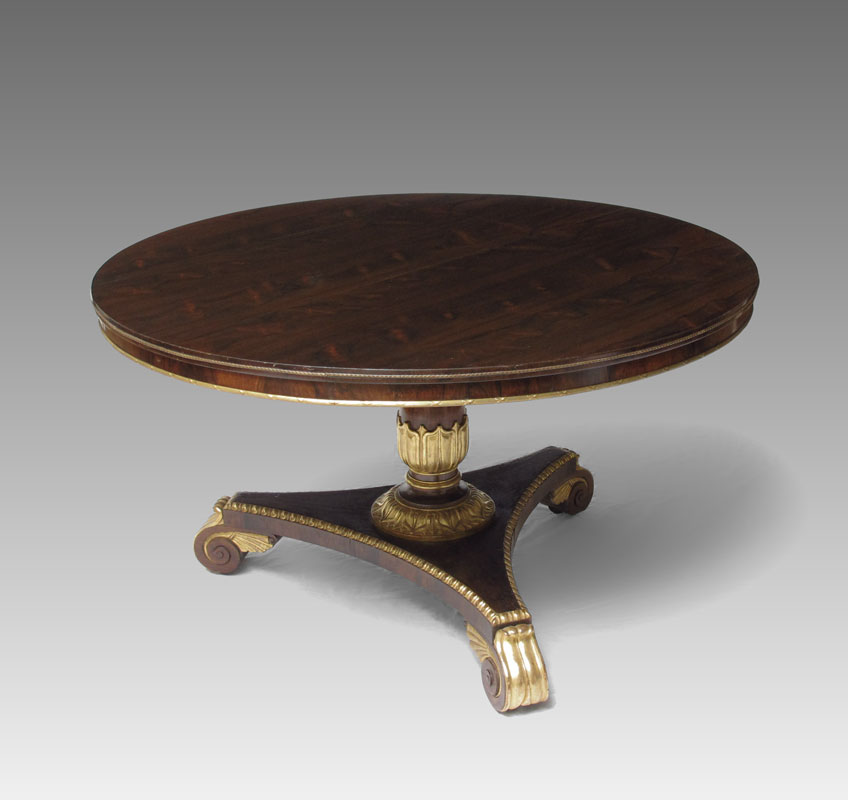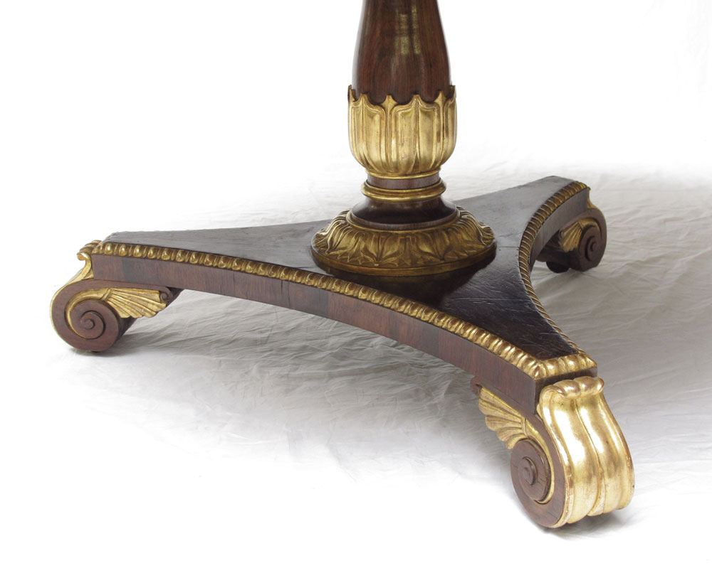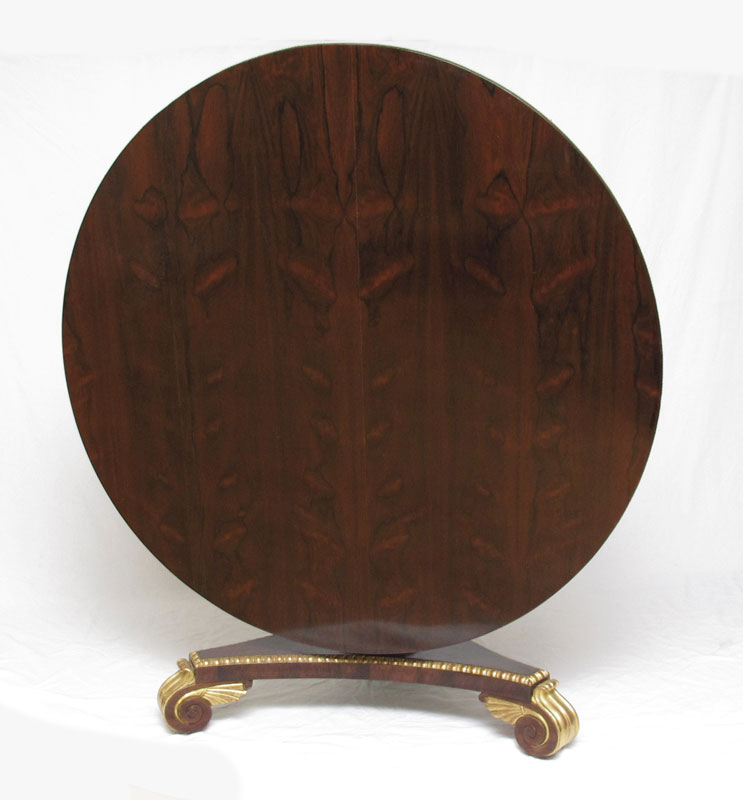 REGENCY ROSEWOOD TILT TOP CENTER TABLE: Tilt top with ormolu border, well carved ormolu and parcel gilt shaft pedestal, concave triangular base on scroll feet. Approx. 50'' dia., 28'' tall.