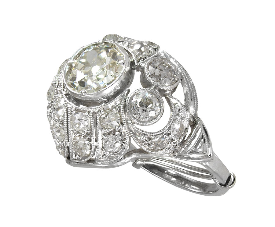STUNNING PLATINUM 3.45 CTW DIAMOND DOME RING: An asymmetrical design featuring an approx. 1.45 Ct. old European round cut diamond rated VS2 in clarity and M in color. The additional 24 old mine and old European round cut diamonds total approx. 2. Ct., VS-SI in clarity and H-I in color. The center diamond is prong set. The small diamonds are bezel set. Size 6. Weight 7.5. Sold with current Florida Diamond Appraisers GIA graduates appraisal for $13,550.