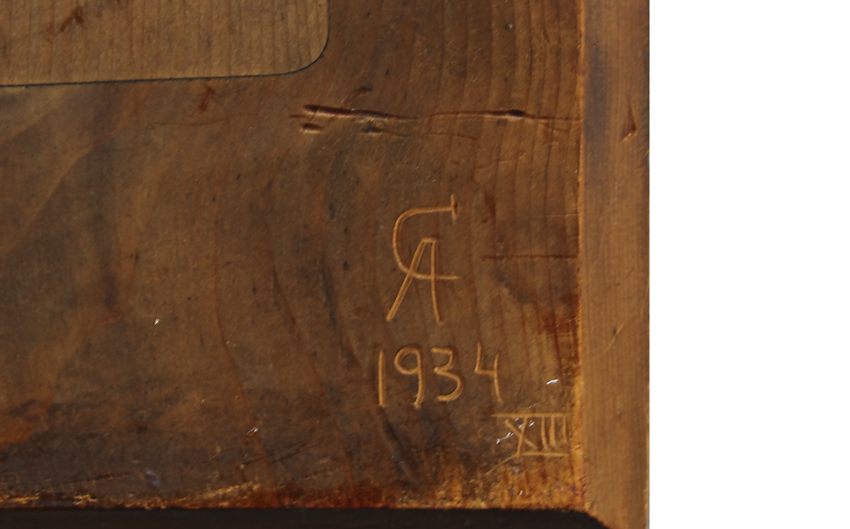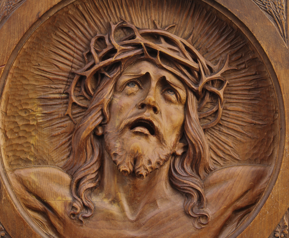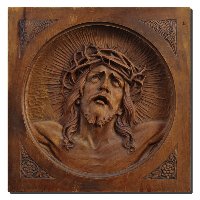 CARVED WOOD RELIEF PLAQUE OF CHRIST WEARING A CROWN OF THORNS: Carved from one piece of wood, total measurement 13'' x 12 3/4'', monogrammed verso CA, dated 1934.