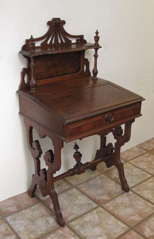 VICTORIAN RENAISSANCE REVIVAL WALNUT DESK: Slightly slanted, lift top writing desk with backsplash. Compartmented interior. Approx. 50'' tall x 26.5'' x 22''.