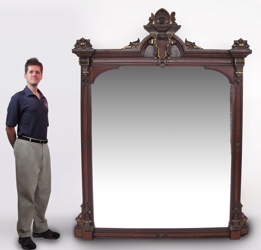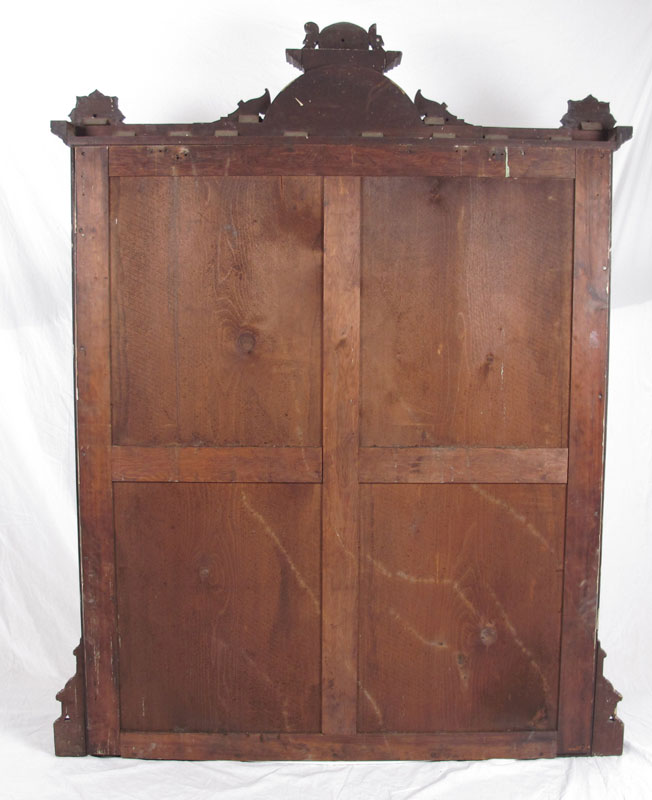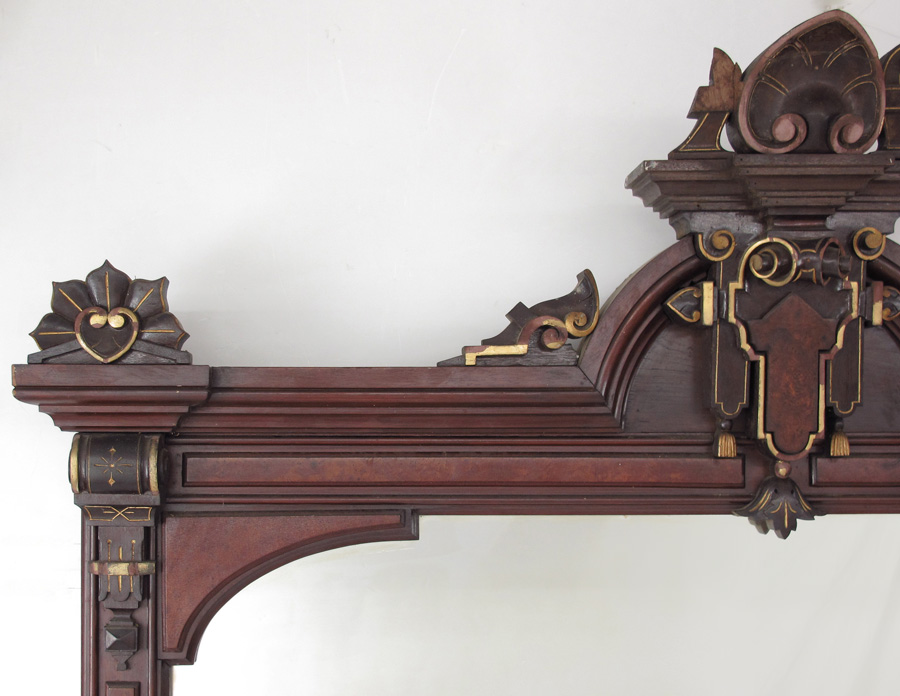 LARGE RENAISSANCE REVIVAL WALNUT MIRROR: Frame with applied carved decoration with gilt accents, burl veneer panels. Approx. 82 3/4'' h. x 63'' x 5''.