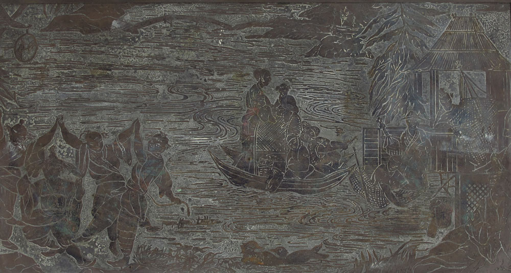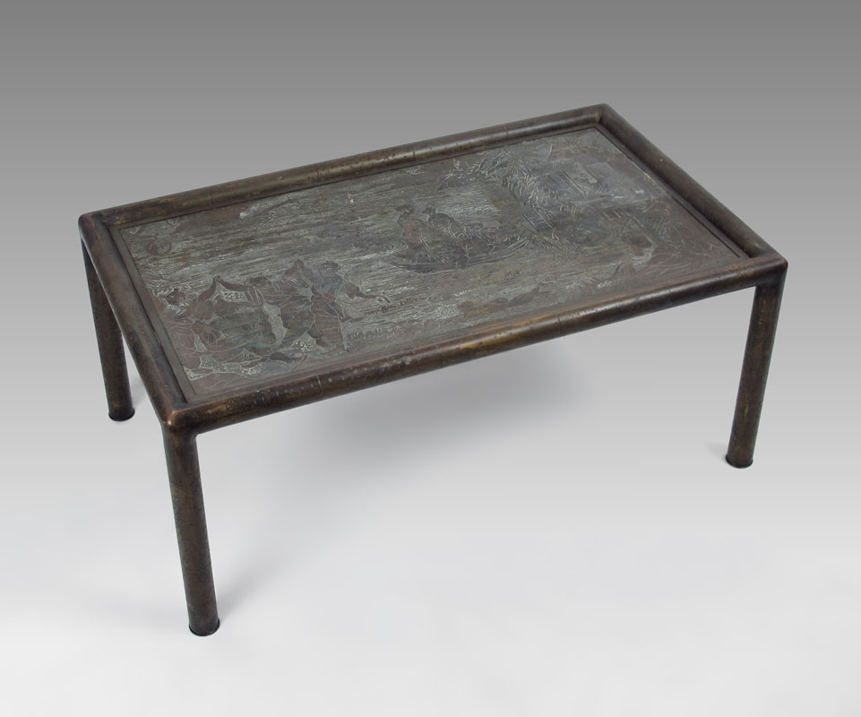 PHILIP AND KELVIN LAVERNE COFFEE TABLE: Oriental motif top of fishermen with traces of original enamel remaining, bamboo motif frame and legs. Signed Philip & Kelvin Laverne. 14 1/2'' h. x 34'' x 19 3/4''.
