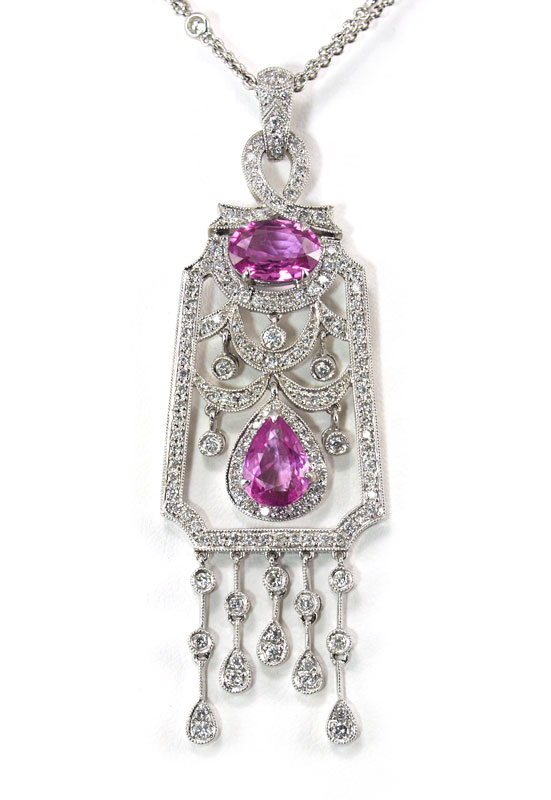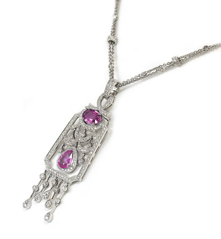 18K PINK SAPPHIRE AND DIAMOND PENDANT NECKLACE: 18K white gold necklace featuring an oval and a pear shaped mixed cut pink sapphires rated VS clarity and totaling 3.48 Ct. The 200 round brilliant diamonds total approx. 2.0 Ct, average VS1 in clarity and H-I in color. Length of chain is 16''. Weight 19.3 grams. Sold with current Florida Diamond Appraisers GIA graduates appraisal for $7,850.