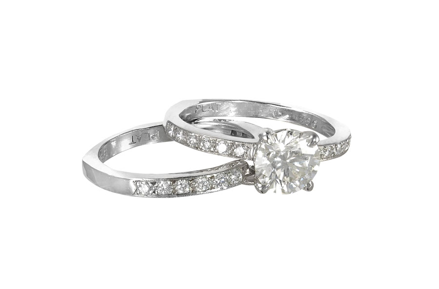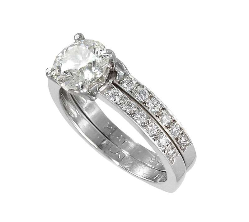 PLATINUM WEDDING SET, DIAMOND ENGAGEMENT RING AND BAND: Platinum engagement ring centers a transitional round brilliant diamond of approx. 1.07 Ct., rated VS1 in clarity and K color. The shank and the band contain an additional 24 round brilliant cut diamonds totaling approx. .36 Ct., averaging VS in clarity and H-I color. The center diamond is prong set, the others are bead set. Weight 7.4 grams. Sold with current Atlanta Gemological GIA graduates appraisal for $9750.