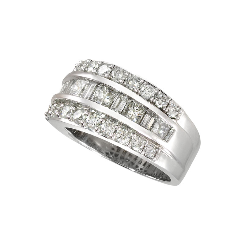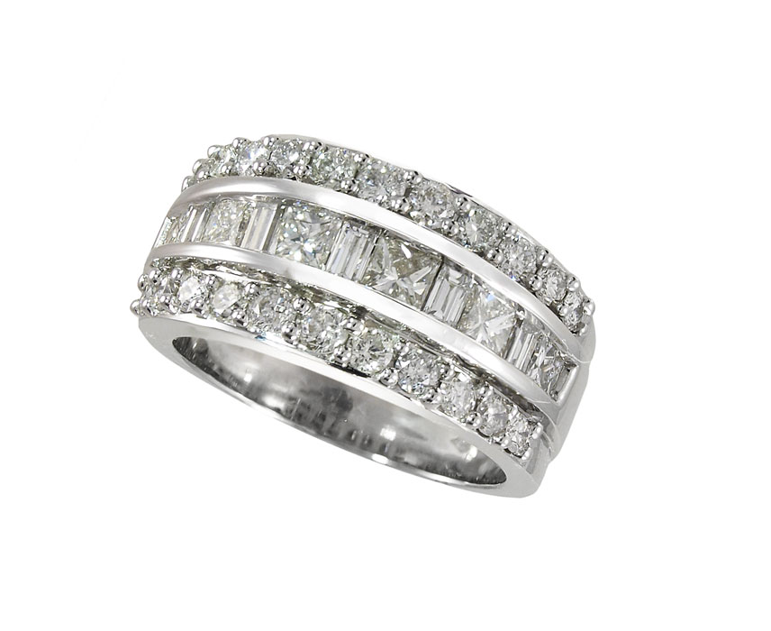 14K DIAMOND BAND RING: Signed Kallati 14K white gold ring of 33 diamonds all totaling approx. 2. Ct., rated VS-SI in clarity and G-H color. The diamonds are 22 round brilliant, 6 Princess cut and 5 baguette. Prong and channel set. Weight 9.2 grams. Sold with current Florida Diamond Appraisers GIA graduates appraisal for $4,750.