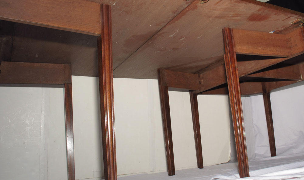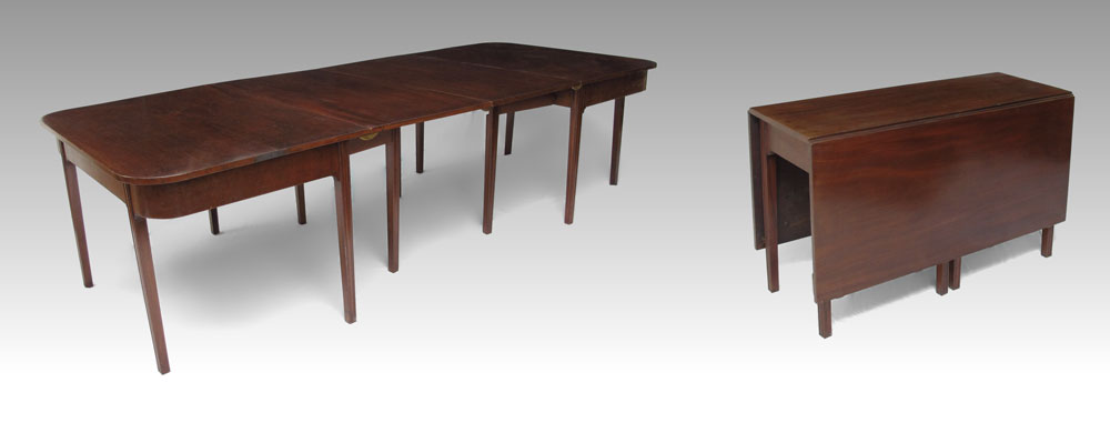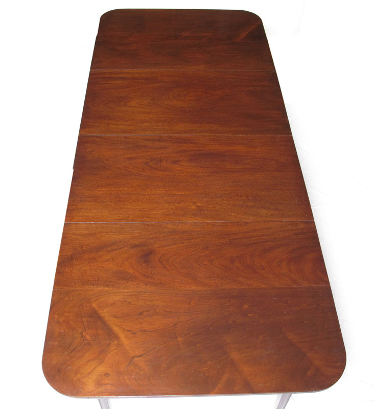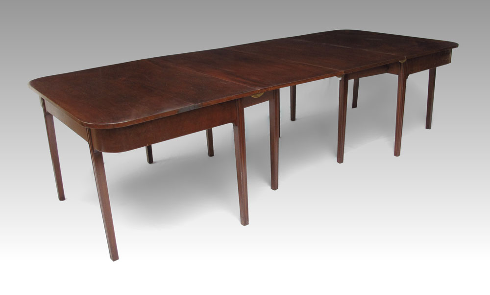 MAHOGANY THREE PART D END DINING TABLE: Each end section 28 3/4'' h. x 47 1/4'' x 32''; center section 18'' wide with drop leaves down, 21 1/2'' leaves; sold with 2 leaves 24'' wide.