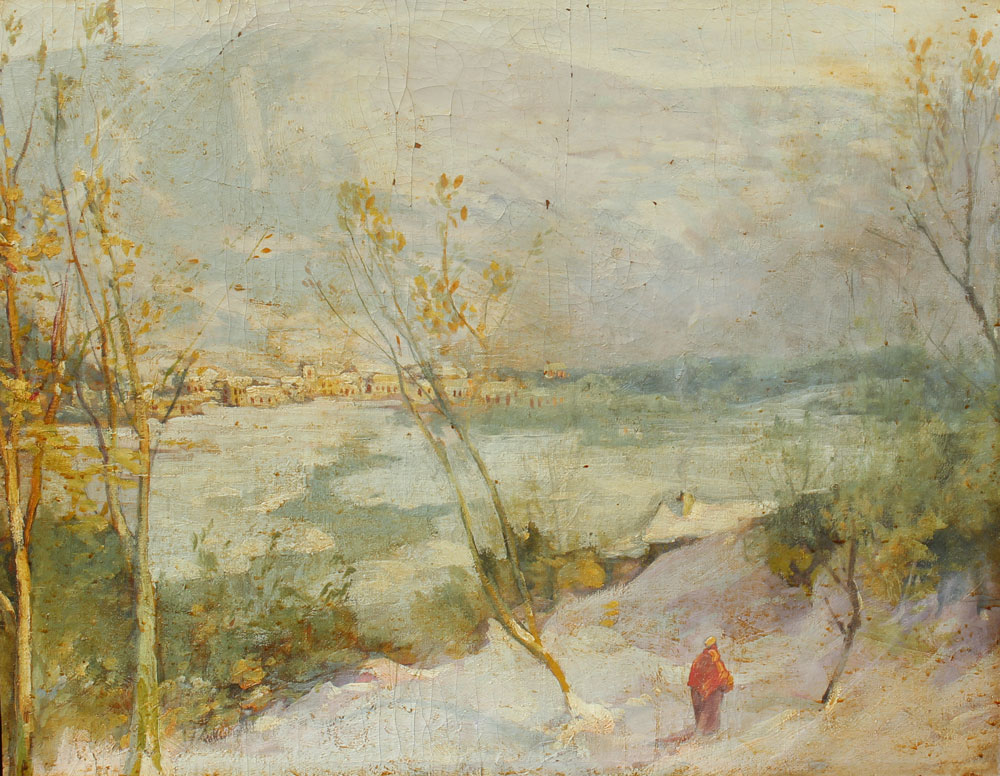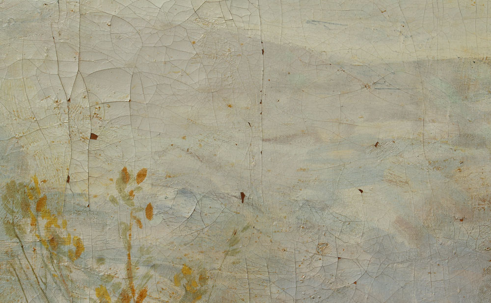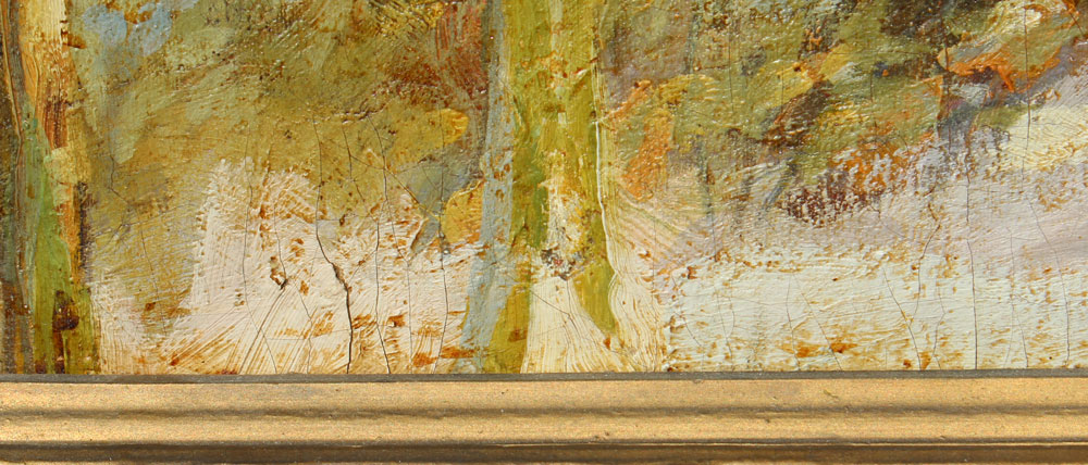CONDITION: Scattered cracklure with several flecks of paint loss, needs cleaning.
