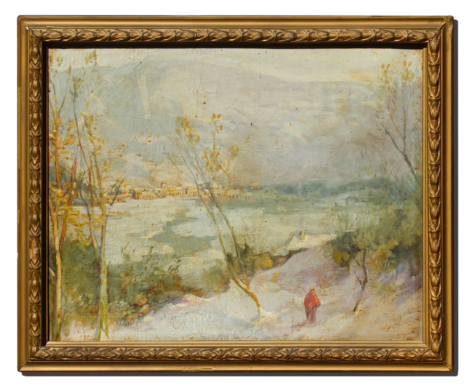 GOOD UNSIGNED EUROPEAN LANDSCAPE WITH FIGURE: City in the distance, Oil/Canvas, 26'' x 33'', encased in gilded gesso frame with wear and overpaint, 31'' x 37 1/2''.