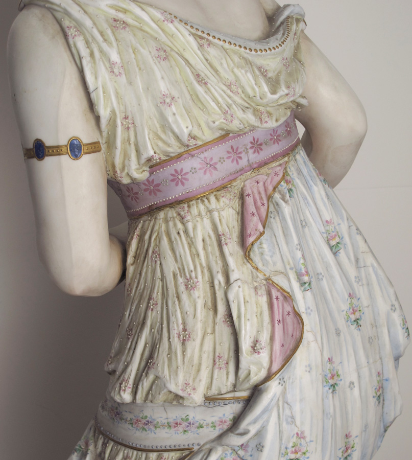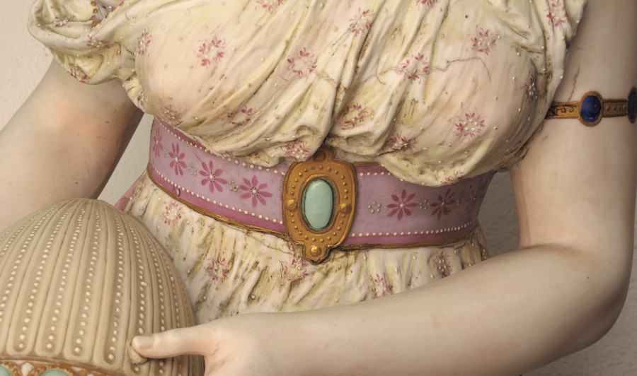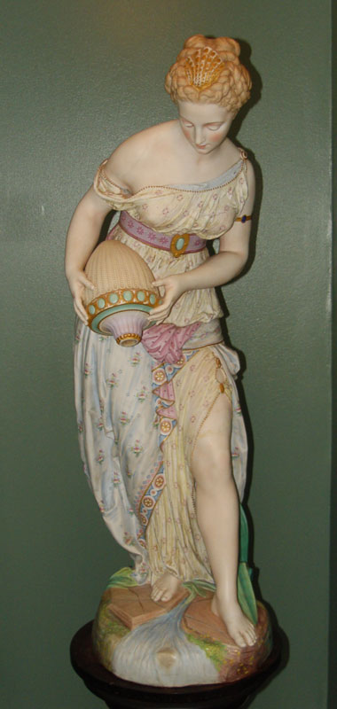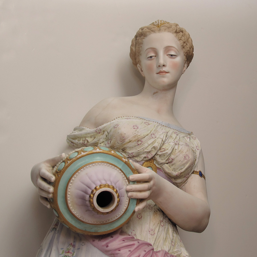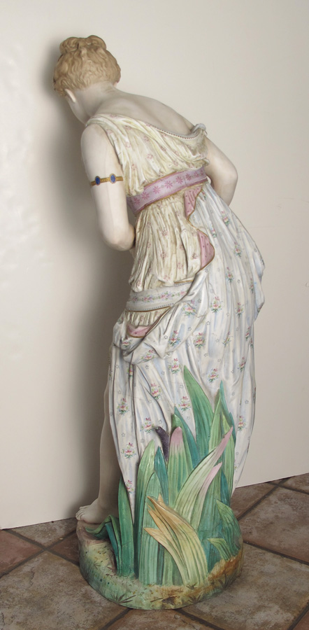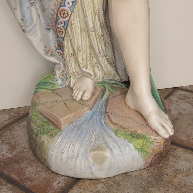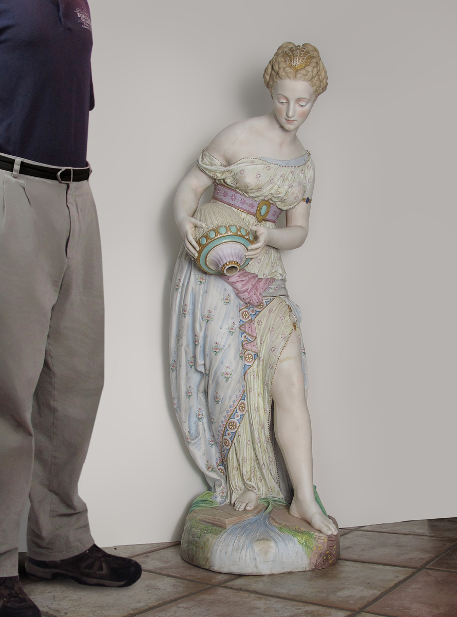PAINTED BISQUE CHELSEA SCULPTURE 46 INCHES IN HEIGHT OF A YOUNG MAIDEN POURING FROM A VESSEL: The sculpture has had repairs. Please take note, another sculpture of this particular subject had a Chelsea mark to the base; however, the restoration to this piece has covered up any such markings.