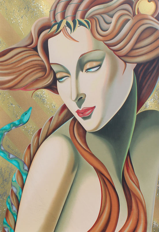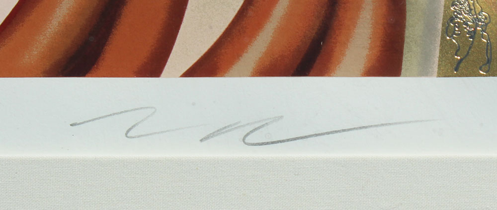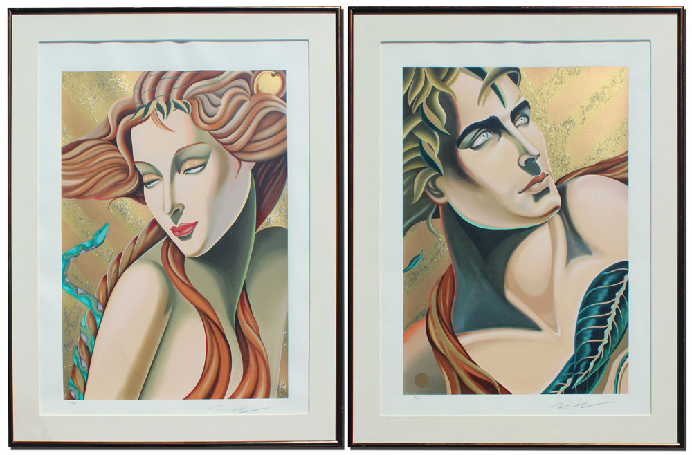 TWO ILLEGIBLY SIGNED DECO STYLE EMBOSSED SERIGRAPHS IN THE STYLE OF LEMPICKA: Sight size 34'' x 25'' each, numbered lower left 49/325, matching metal frames, 40 1/2'' x 31 1/2''.