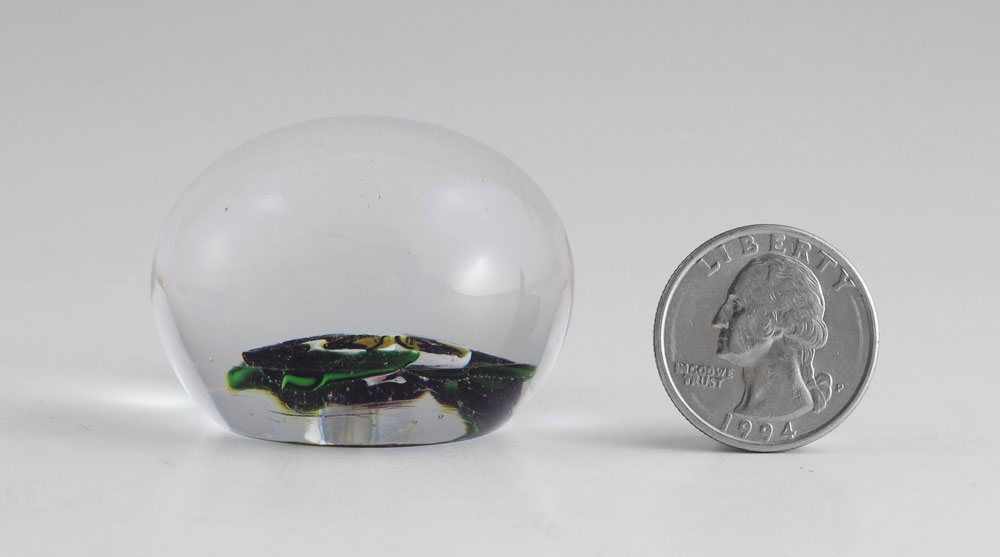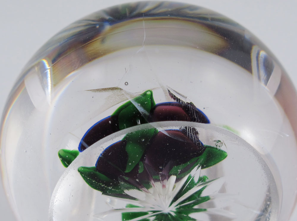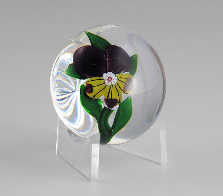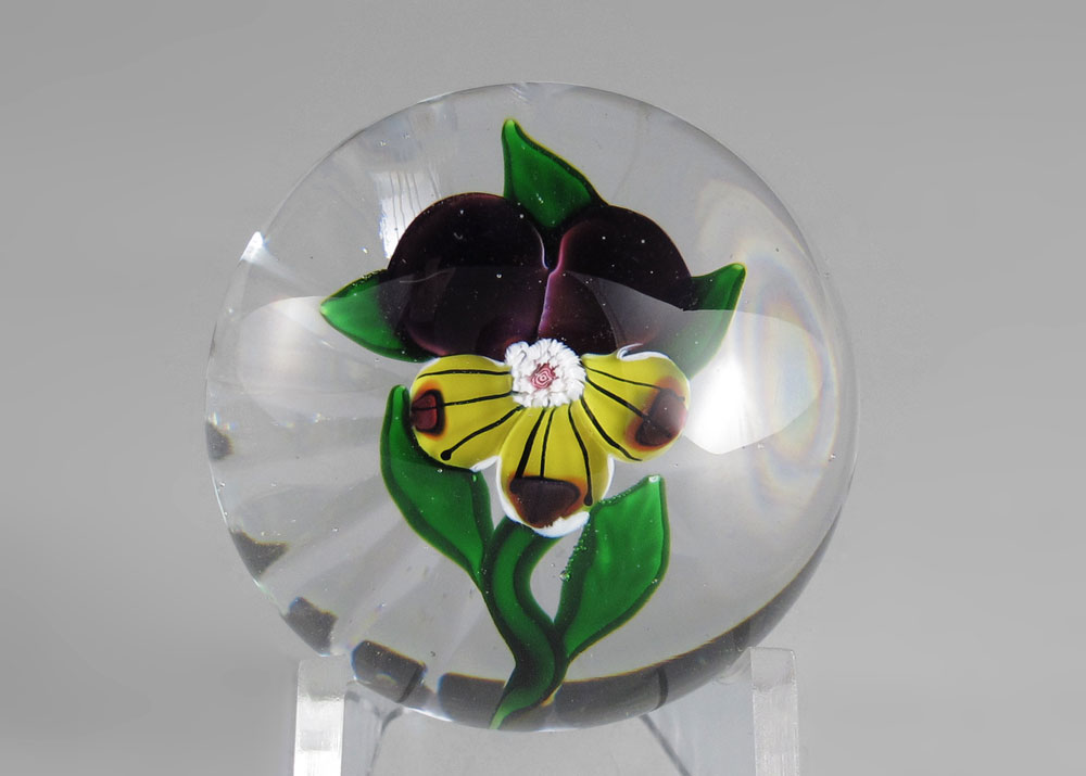 ANTIQUE BACCARAT MINIATURE PANSY PAPERWEIGHT CA 1845-1860: Clear glass with interior pansy. Star cut base type III. 2'' dia.