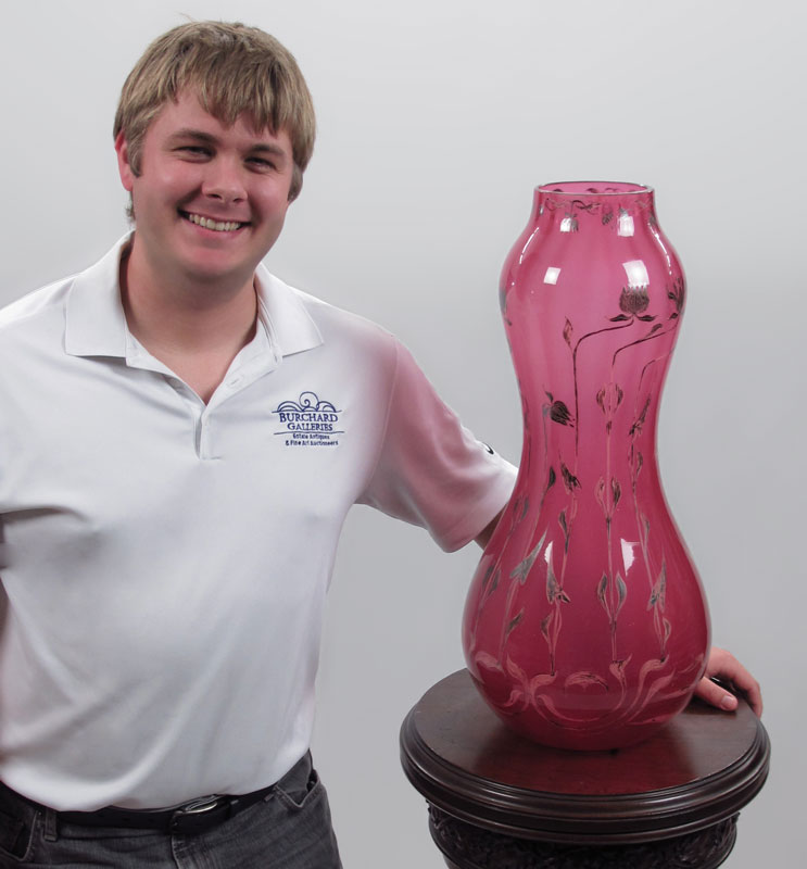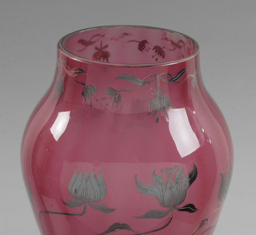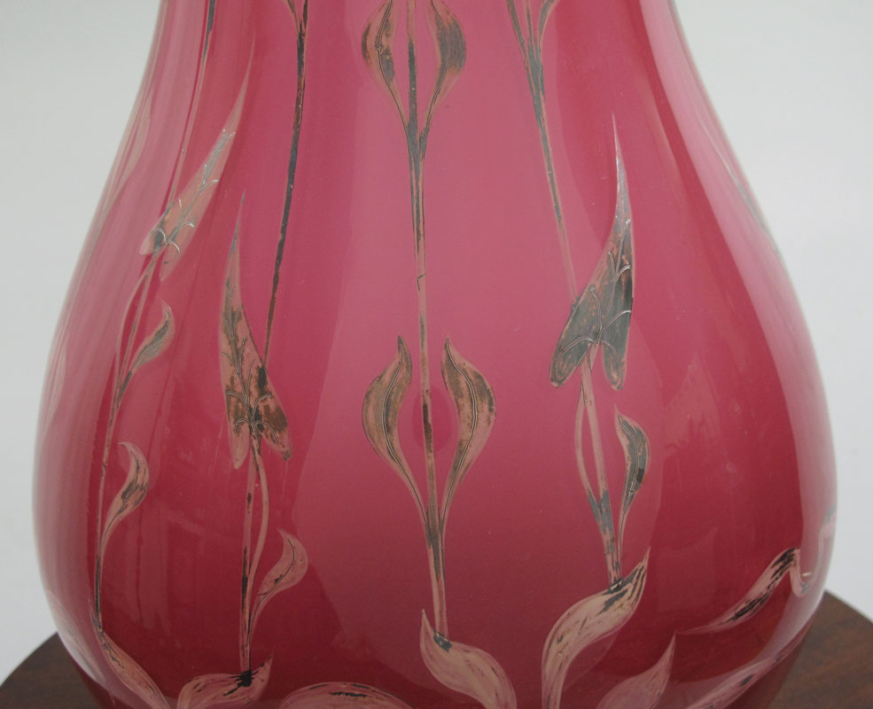LARGE SILVER OVERLAY CRANBERRY GLASS VASE: Frosted cranberry glass with floral design silver overlay. Unmarked. 24'' h. x 11'' dia.