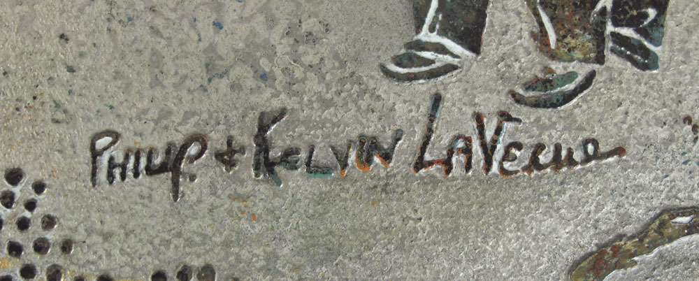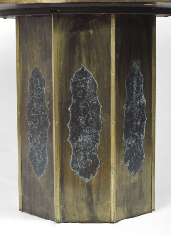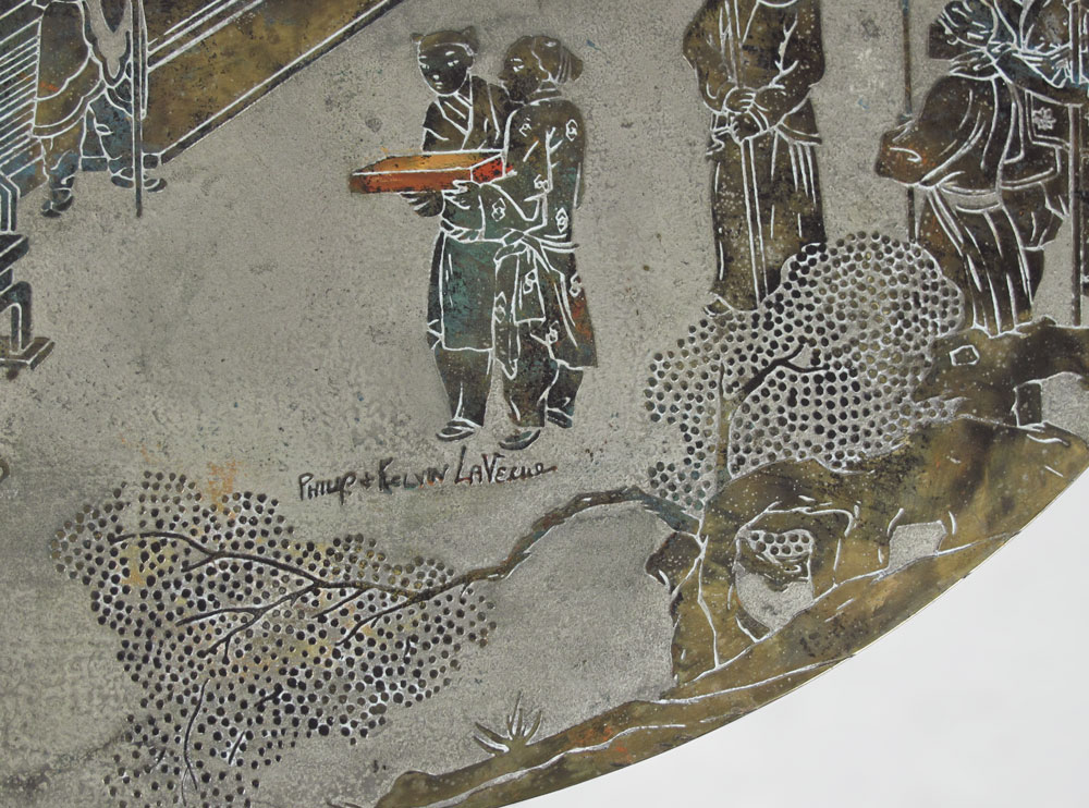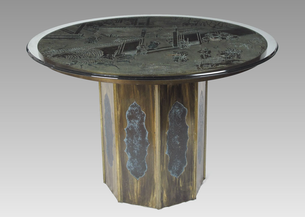 PHILIP & KELVIN LAVERNE ORIENTAL DINING TABLE: Bronze clad top with oriental motif, hand colored highlights. Octagonal base. Signed in surface on top. Measures 28 3/4'' h. x 40'' dia. Sold with glass top, 43 3/4'' dia.