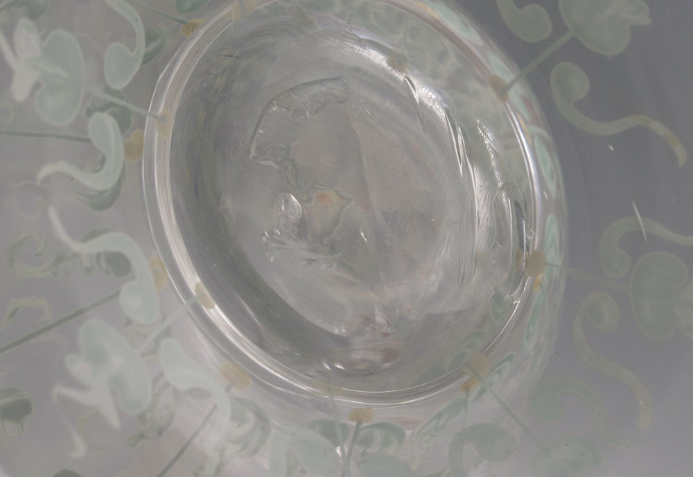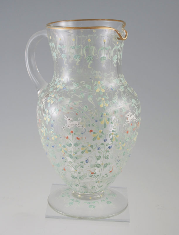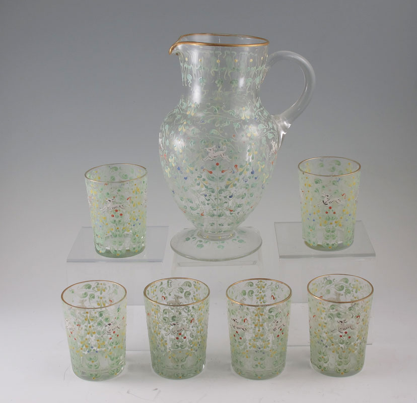 MOSER ENAMELED JUICE SET: 7 piece pitcher and 6 glasses decorated in a dense foliage Bohemian type scroll design with running white stag. Pitcher measures 9'' tall, tumblers 3 1/2''.