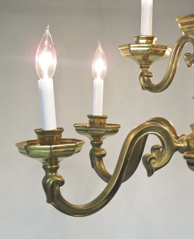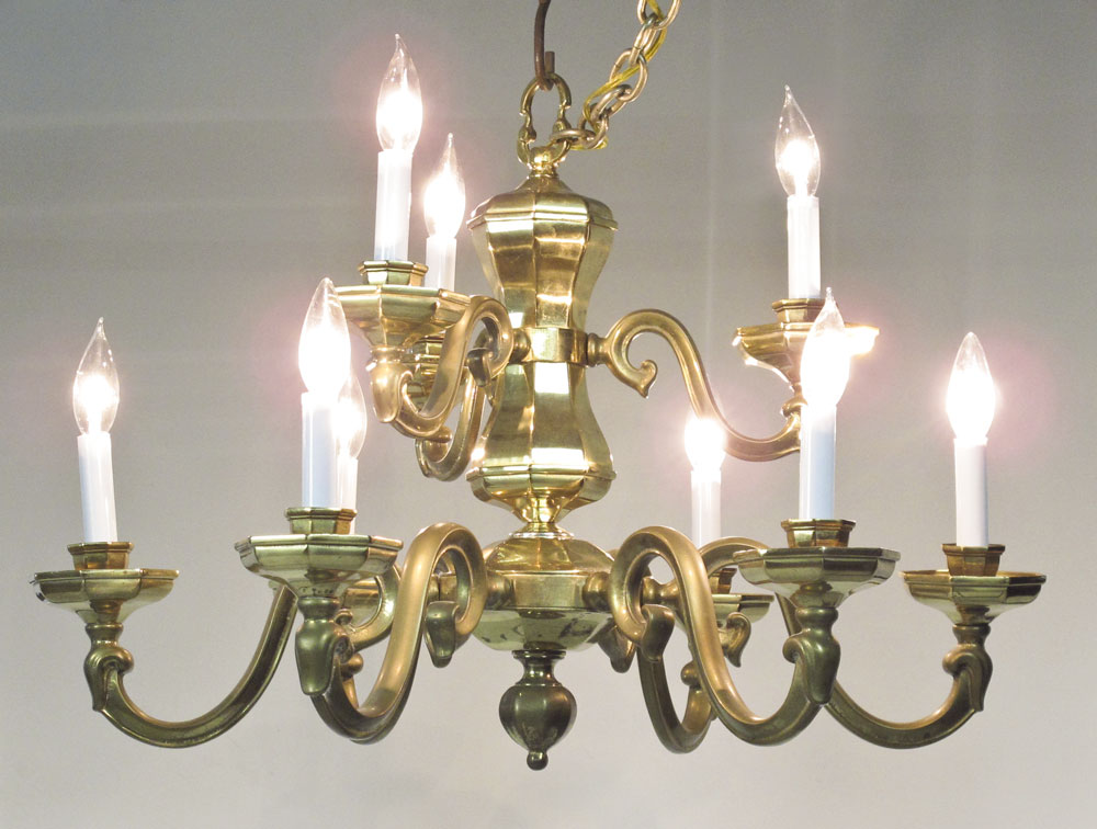 BRASS 9 LIGHT CHANDELIER: All brass with 9 lights in 2 tiers. 19'' h. excluding chain x 27 1/2''.
