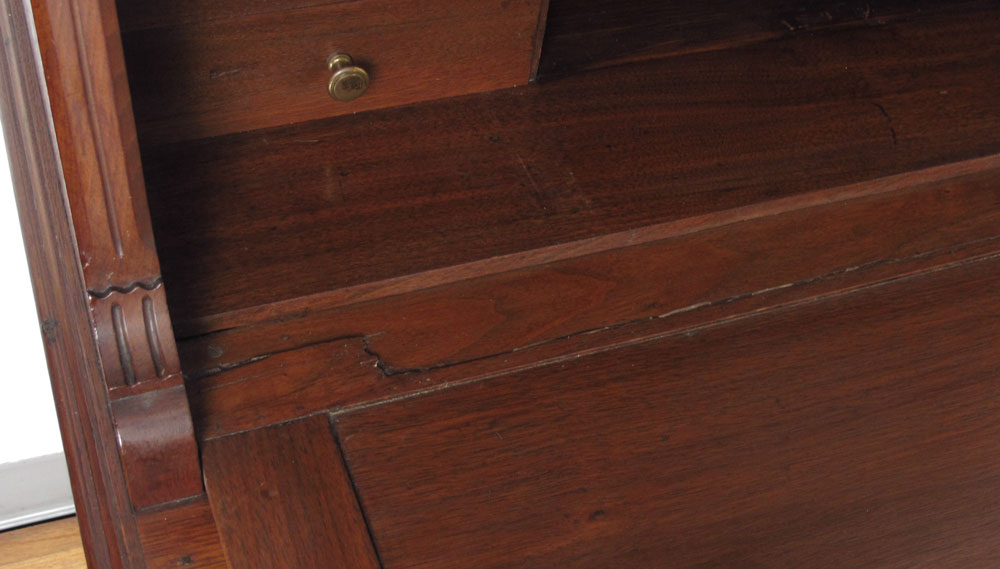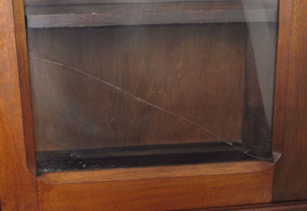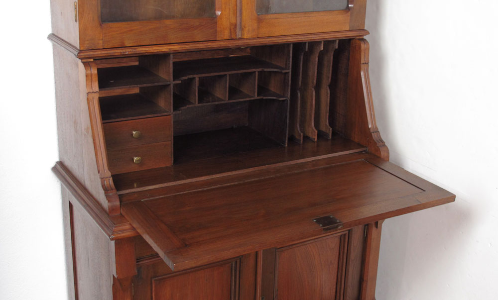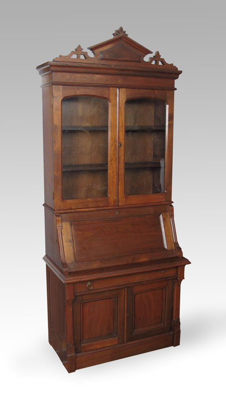 VICTORIAN SECRETARY BOOKCASE: Walnut, upper section with glass front doors, lower fall front desk over 2 drawers over 2 doors. Measures approx. 90'' tall x 32'' x 21''.