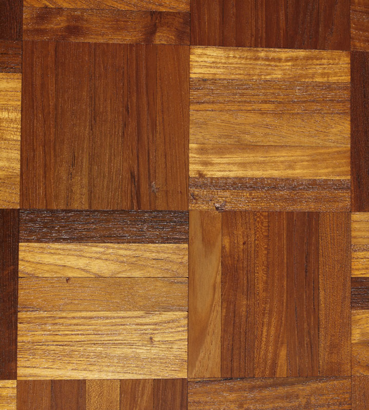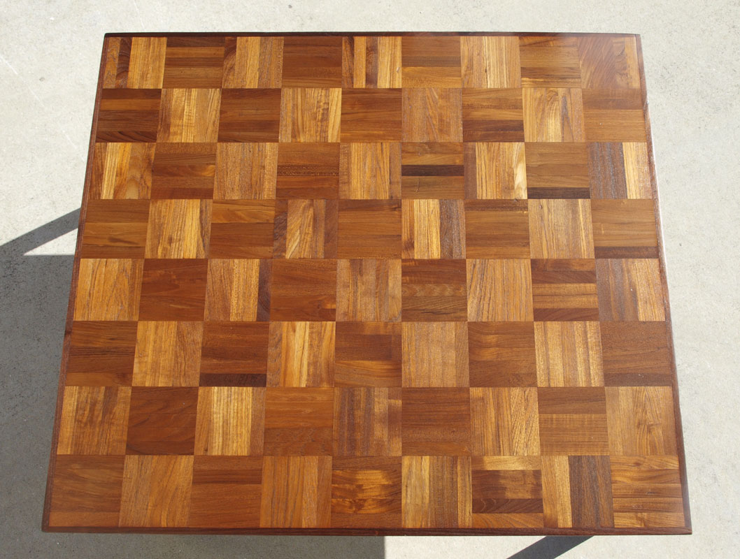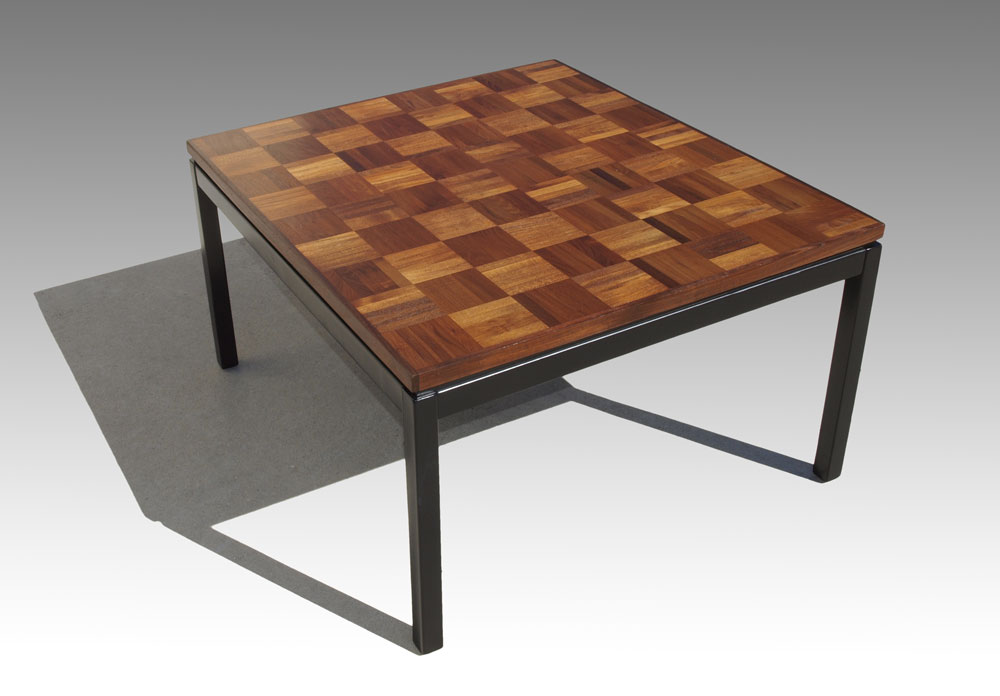 PARQUETRY MODERNE COFFEE TABLE: Teak parquetry squares over painted base. 22 3/8'' h. x 41 3/8'' x 37''.