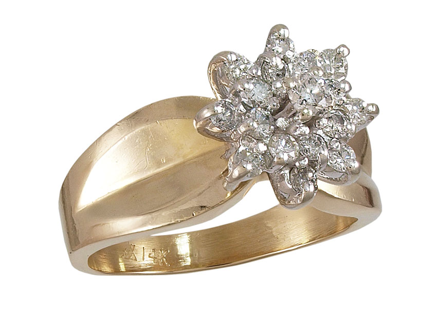 14K DIAMOND STARBURST RING: 14K yellow gold ring contains 17 round brilliant cut diamonds. Weight: .33 Ct. Approx. The diamonds average VS-SI in clarity and H-I in color. The diamonds are prong set. Weight: 6.9 grams. Size: 7