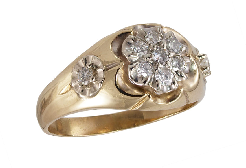 GENTS 14K .75 CTW DIAMOND RING: 14K yellow gold ring contains 9 round brilliant cut diamonds totaling approx. .75 Ct. Rated SI in clarity and H-I in color. The diamonds are prong set. Weight: 6.8 grams Size: 13.25