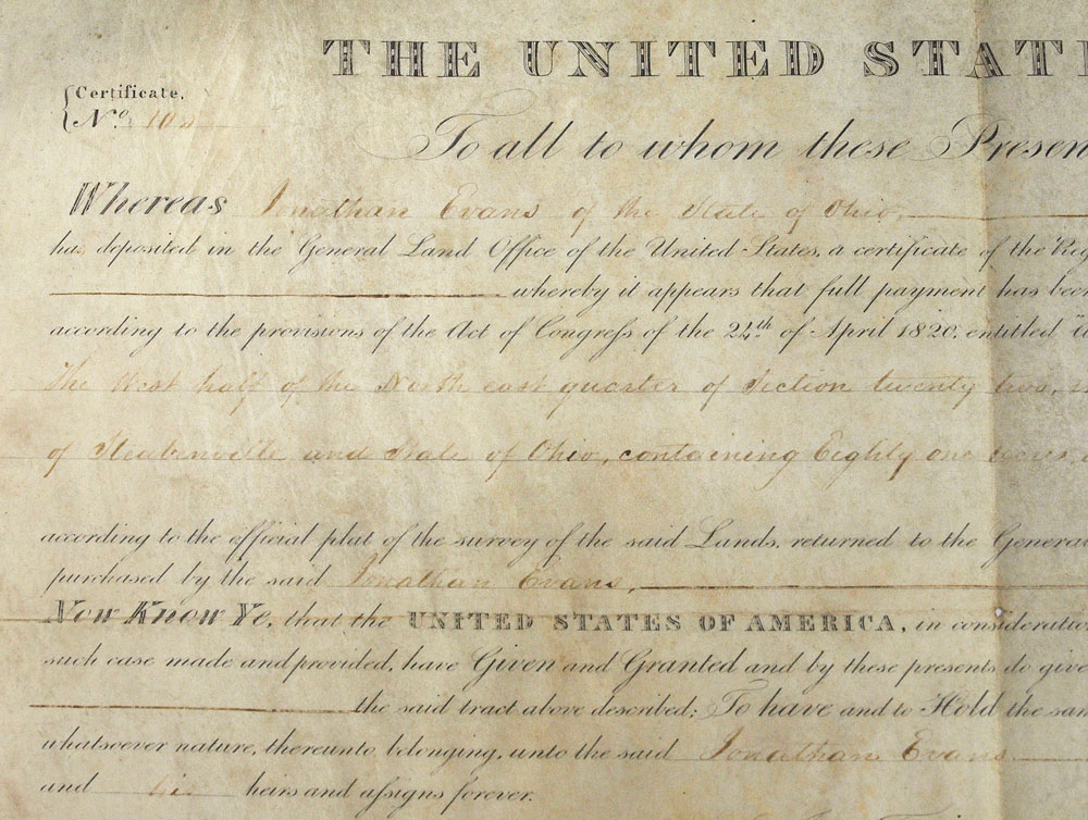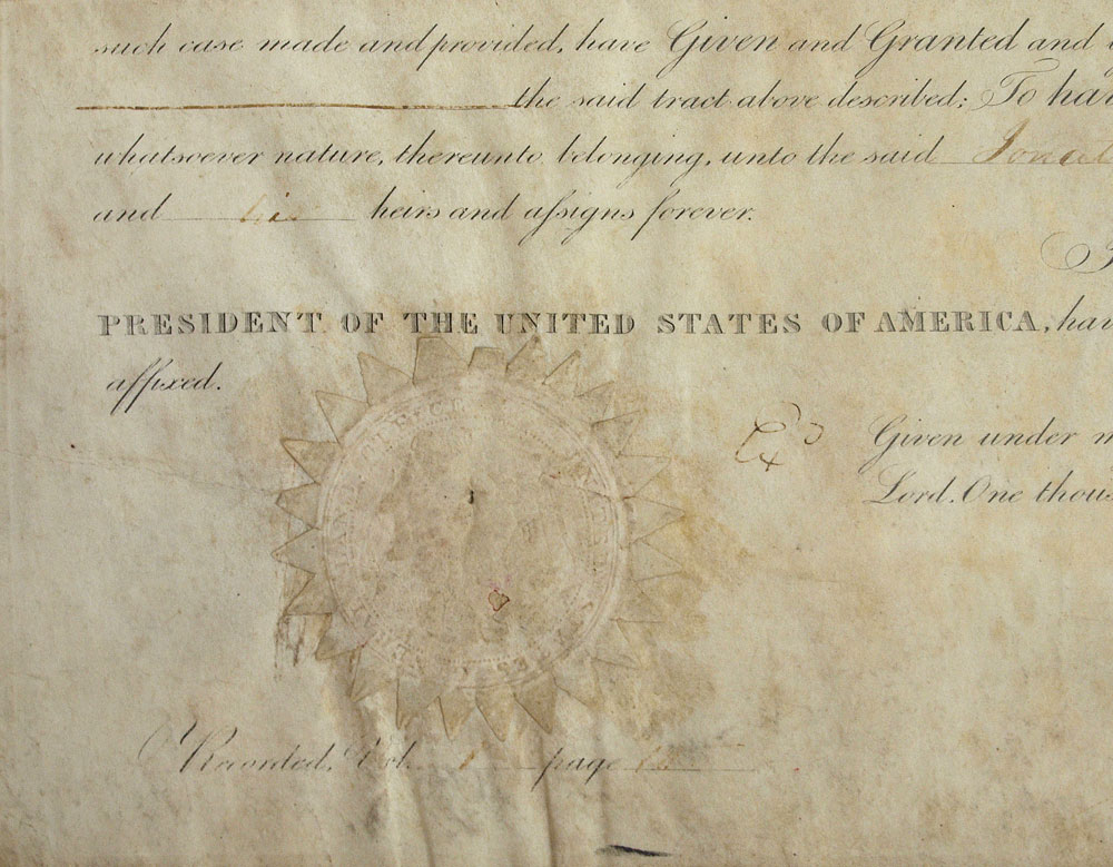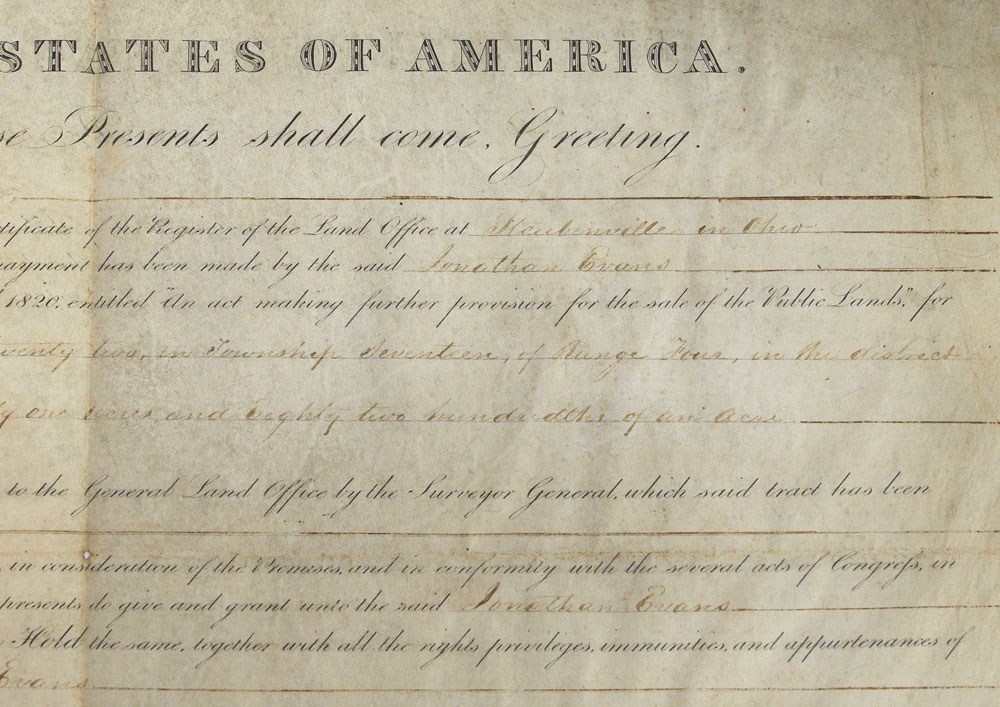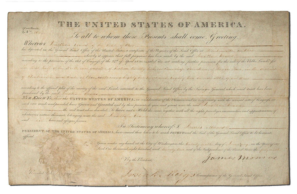 1822 JAMES MONROE PRESIDENTIAL SIGNED LAND GRANT: Land grant in Steubenville, Ohio, signed by James Monroe and Joseph Meigs. Note fold lines, foxing and 1/2'' tear in bottom fold line, doesn't affect text or signature. Measures 10'' x 16''.