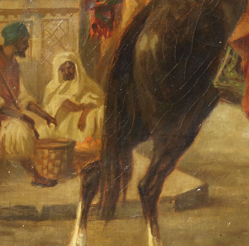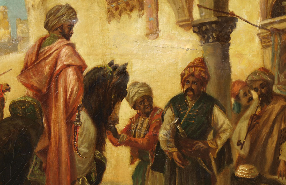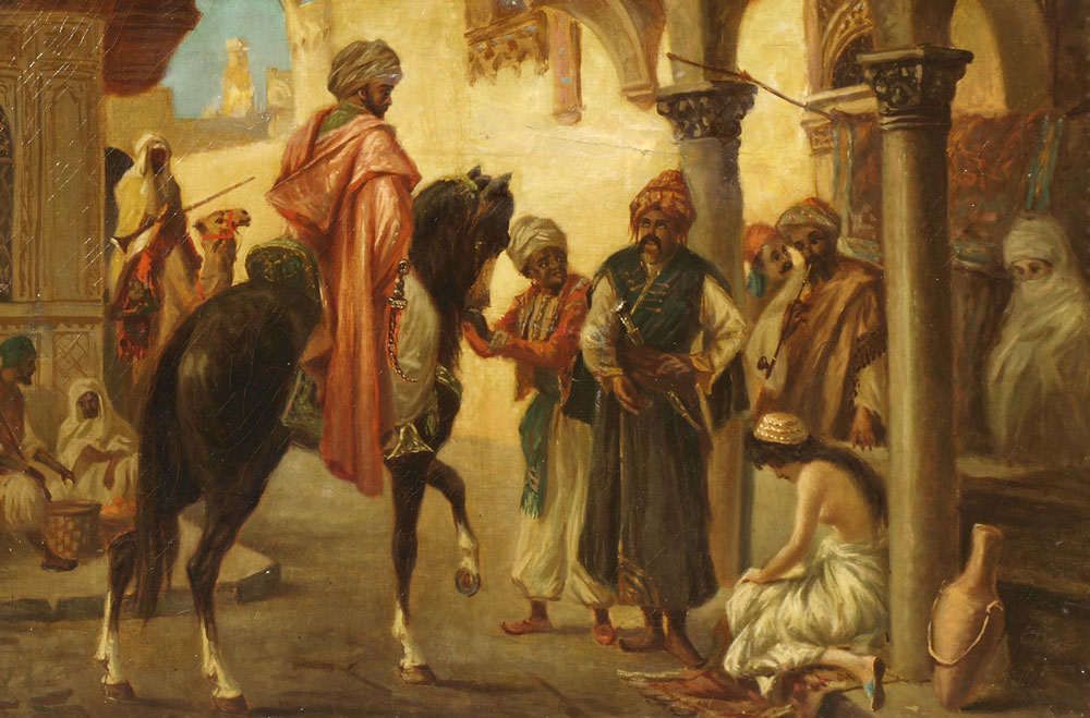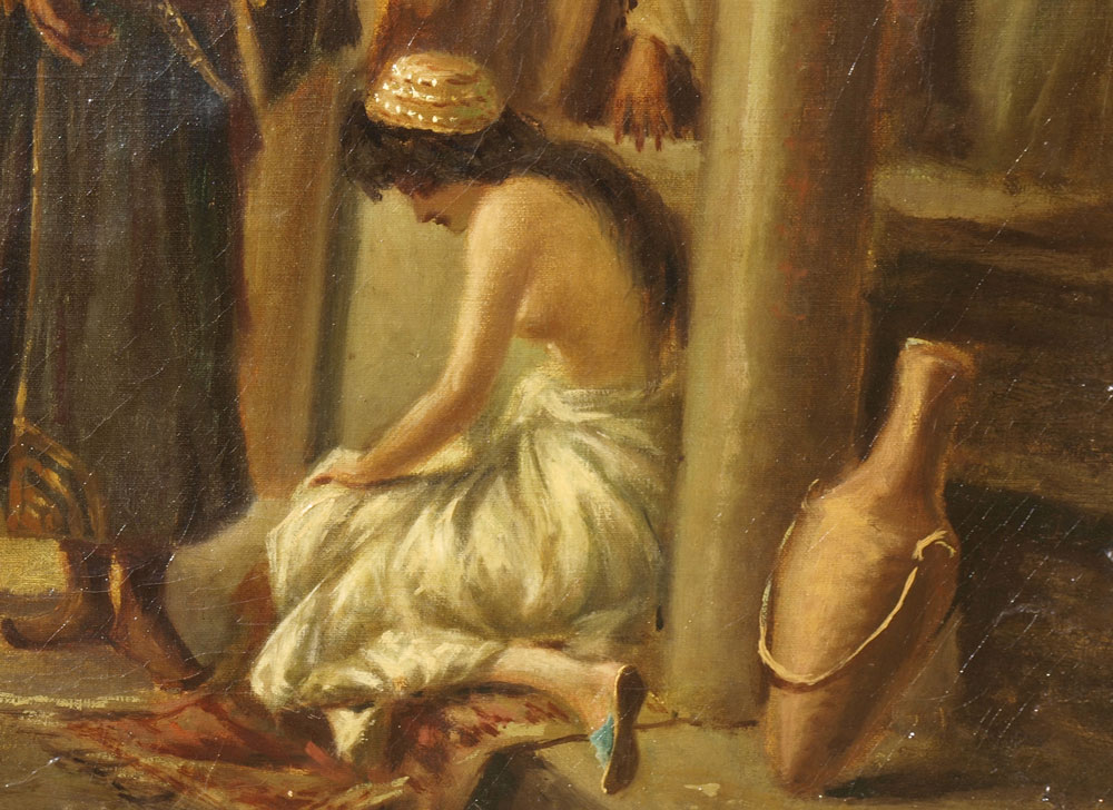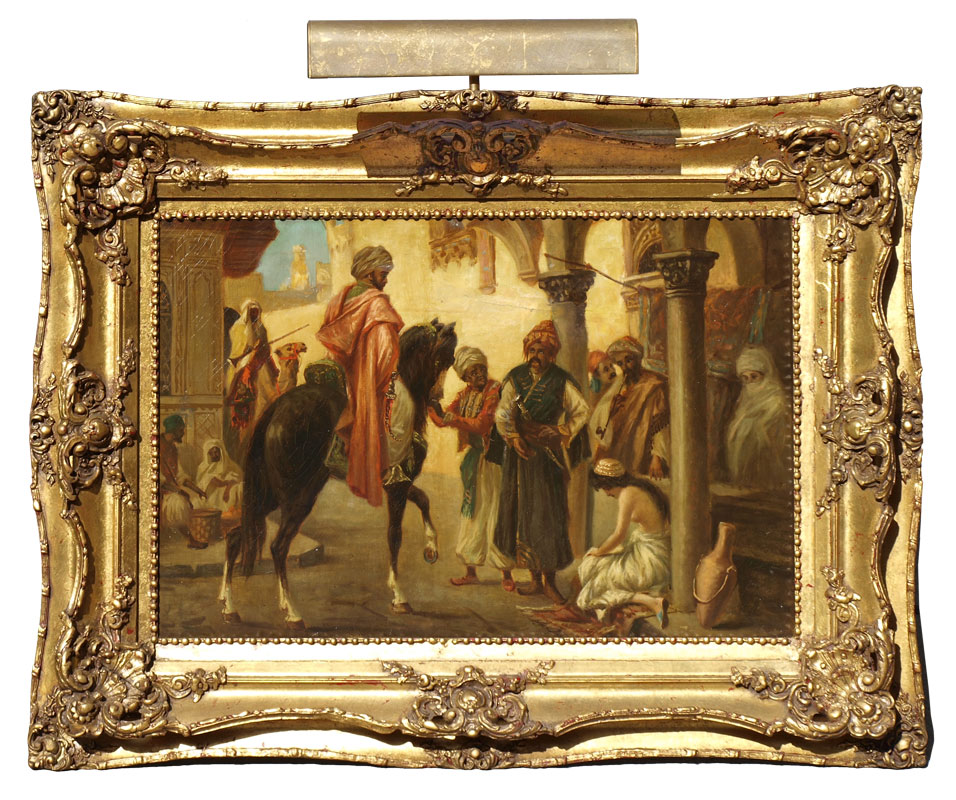 ORIENTALIST SCENE WITH ARABS AND SLAVE GIRL: OIL/Canvas, sight size 19'' x 29 1/2'', encased in carved and gilded gesso frame, 32'' x 42''.