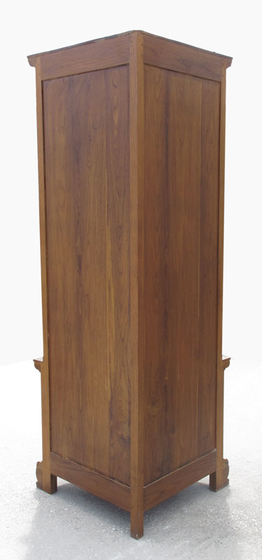 BOWED FRONT CORNER CABINET: 24 panes of beveled glass in the doors, carved trim and carved panels on lower doors. Key in office. Later 20th C. 75 1/2'' x 35'' x 24''.