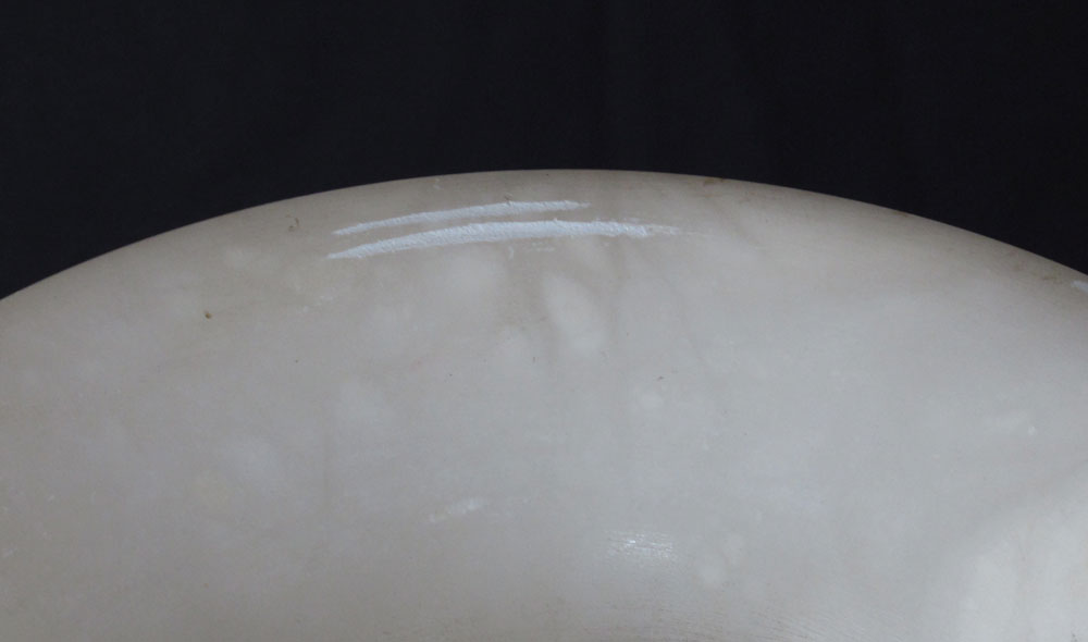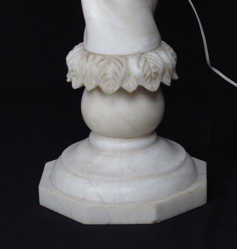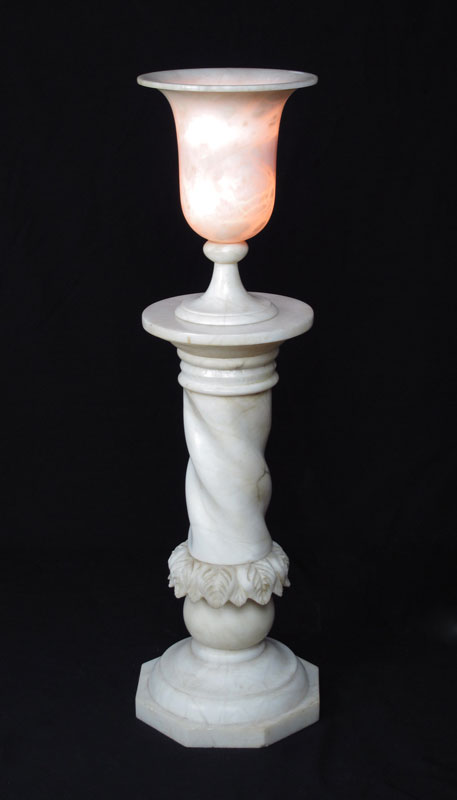 ALABASTER PEDESTAL AND URN TORCHIERE LAMP: Carved white pedestal sold together with the urn form lamp. Pedestal measures 25 1/2'' tall, lamp 13 1/4''.