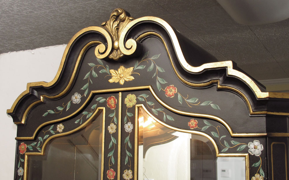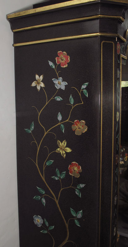 WIDDICOMB BOMBAY SHAPED PAINT DECORATED CABINET: Floral motif with gilt accents. Upper part with illuminated mirrored back interior with glass shelves, beveled glass doors. Bombay lower section with two drawers. Name plate in drawer. Approx. 84'' h. x 44'' x 17 3/4''.