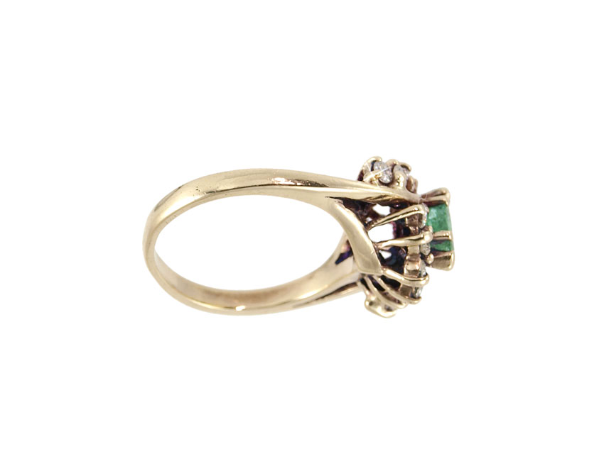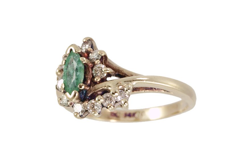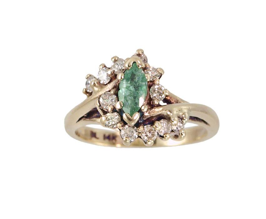 14K EMERALD AND DIAMOND RING: 14K yellow gold ring centers one marquise shaped emerald, approx. .40 Ct.. Accented with 12 round full cut diamonds, approx . .33 Ct. The diamonds average SI in clarity and I-J in color. The diamonds and emerald are prong set. Weight: 5.2 grams. Size: 6.5