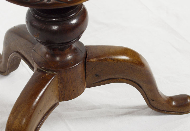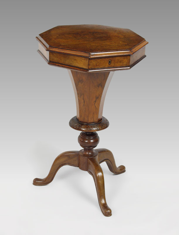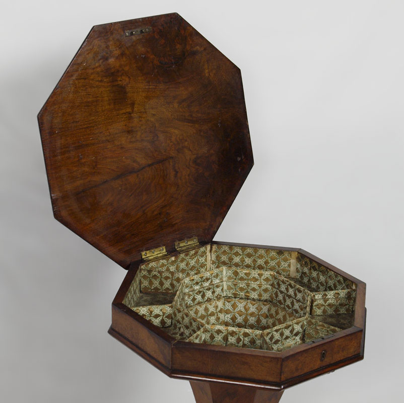 REGENCY BURL WALNUT WORK TABLE: Octagonal top hinged and lifts to the paper lined and compartmented interior. Approx. 28'' tall x 17'' dia.