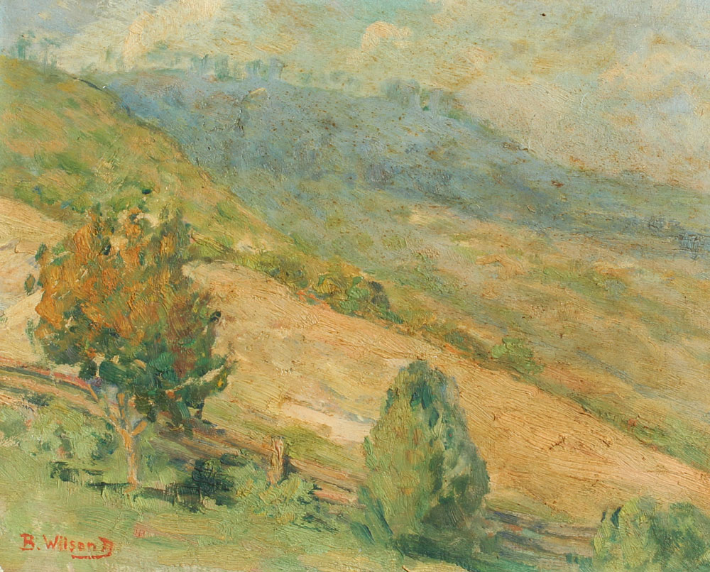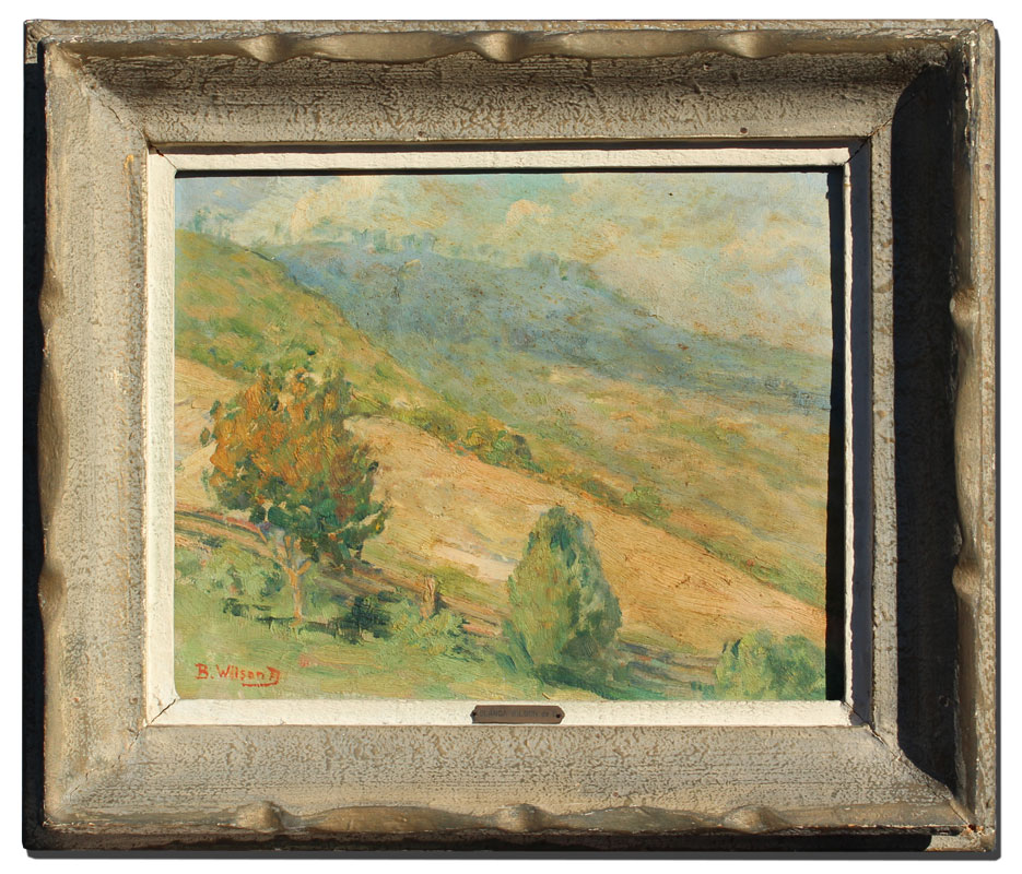 BLANCA WILSON de D ARGENTINIAN LANDSCAPE PAINTING: Titled verso ''Argentin Gugusto?'', OIL/Board, 9 1/4'' x 12'', signed lower left, period carved frame with minor wear, 13 3/4'' x 16''. Needs cleaning.
