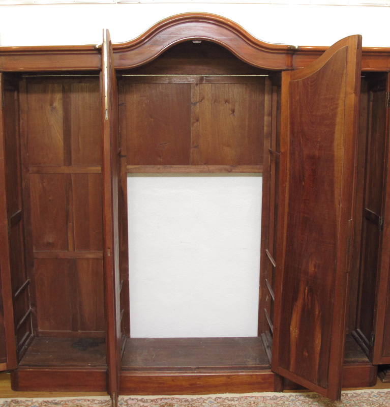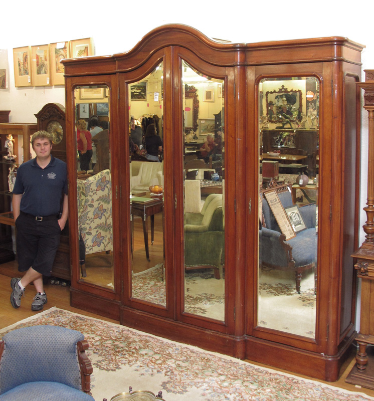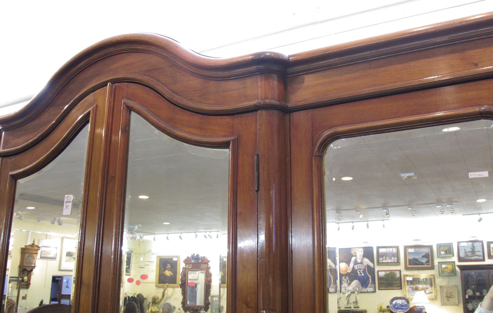 MONUMENTAL 4 DOOR FRENCH ARMOIRE: With beveled glass mirrored doors. Measures 105'' h. x 108 1/2'' x 23''. Imagine this cabinet as a display case.