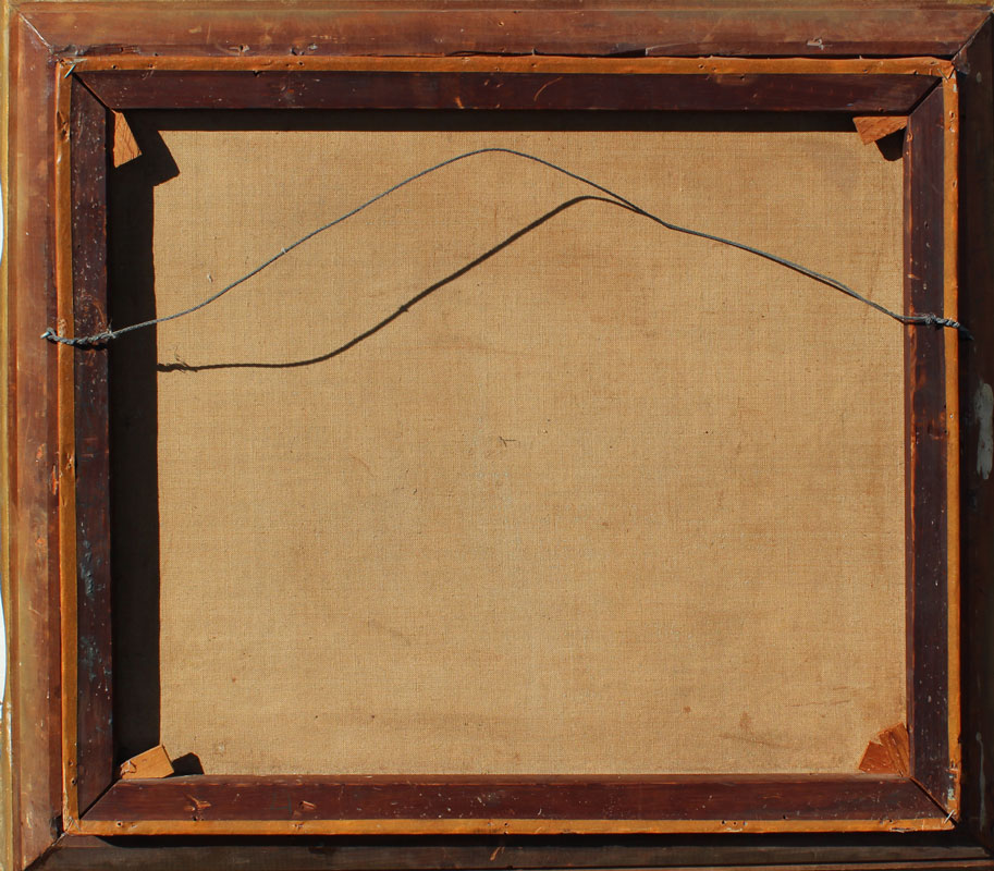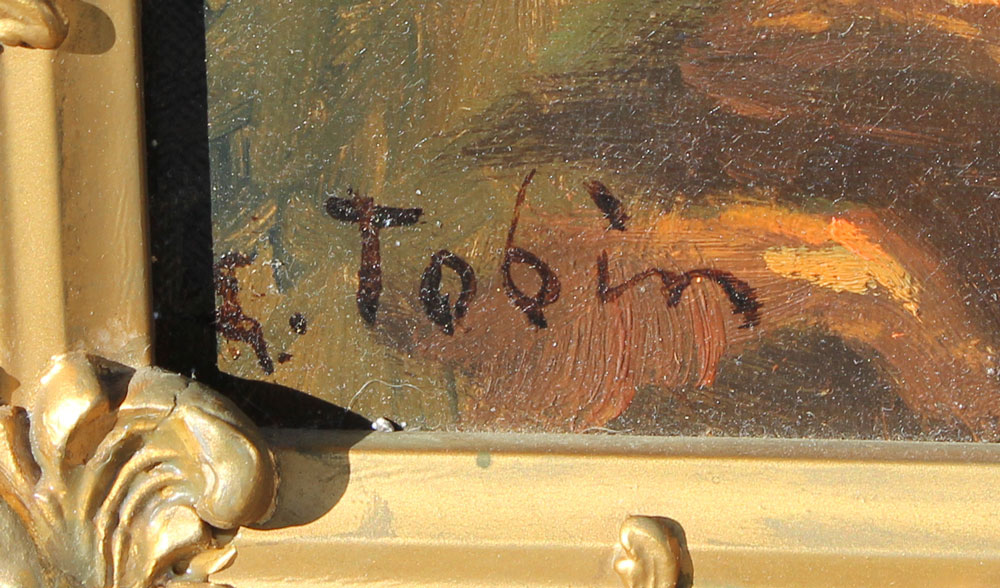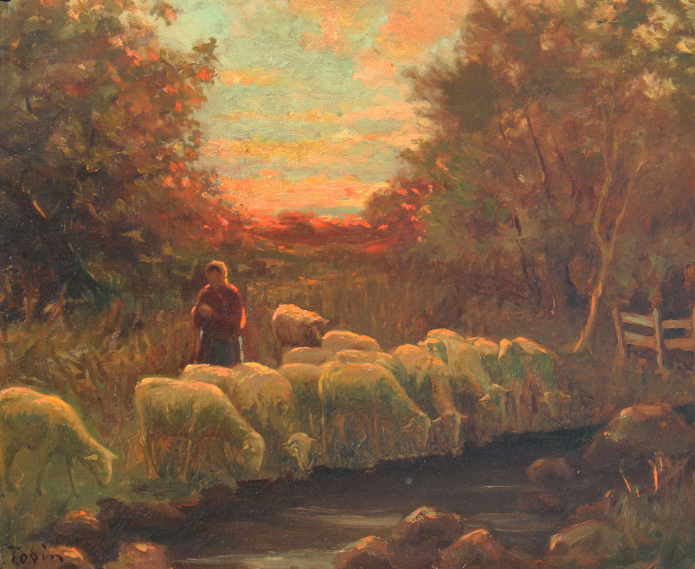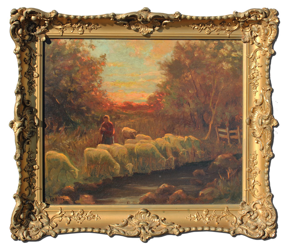 GOOD ILLEGIBLY SIGNED IMPRESSIONIST SCENE WITH SHEPHERDESS AND HER FLOCK OF LAMBS IN A SUNSET LANDSCAPE: 20'' x 24'', signed lower left A. Tobin?, encased in a gilded and carved gesso frame with overpaint and repair, 25'' x 30''.