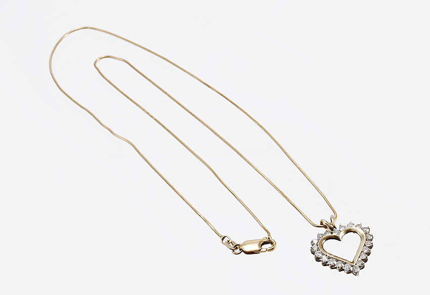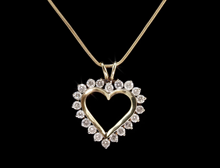 DIAMOND HEART PENDANT NECKLACE: 14K yellow gold pendant contains 20 round full cut diamonds. Weight: 1.00 Ct. Approx. The diamonds average I1-I2 in clarity and I-J in color. The diamonds are prong set. 14K yellow gold 20'' snake chain. Weight: 5.6 grams.