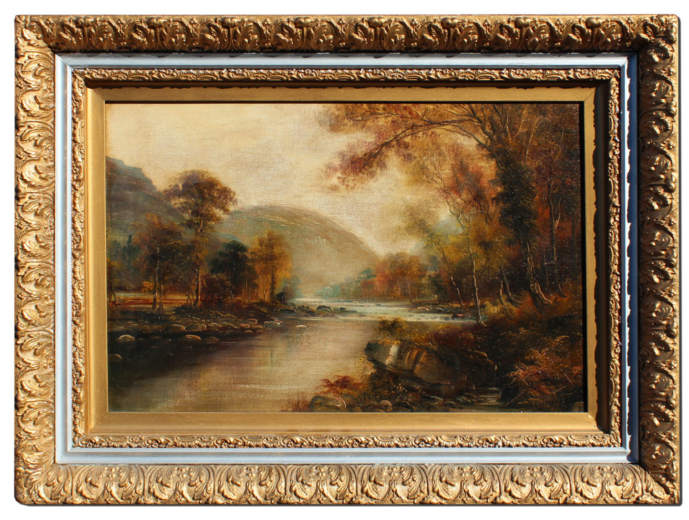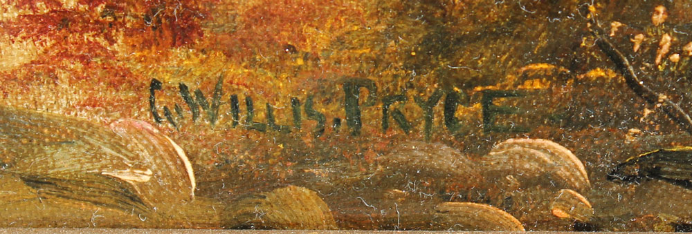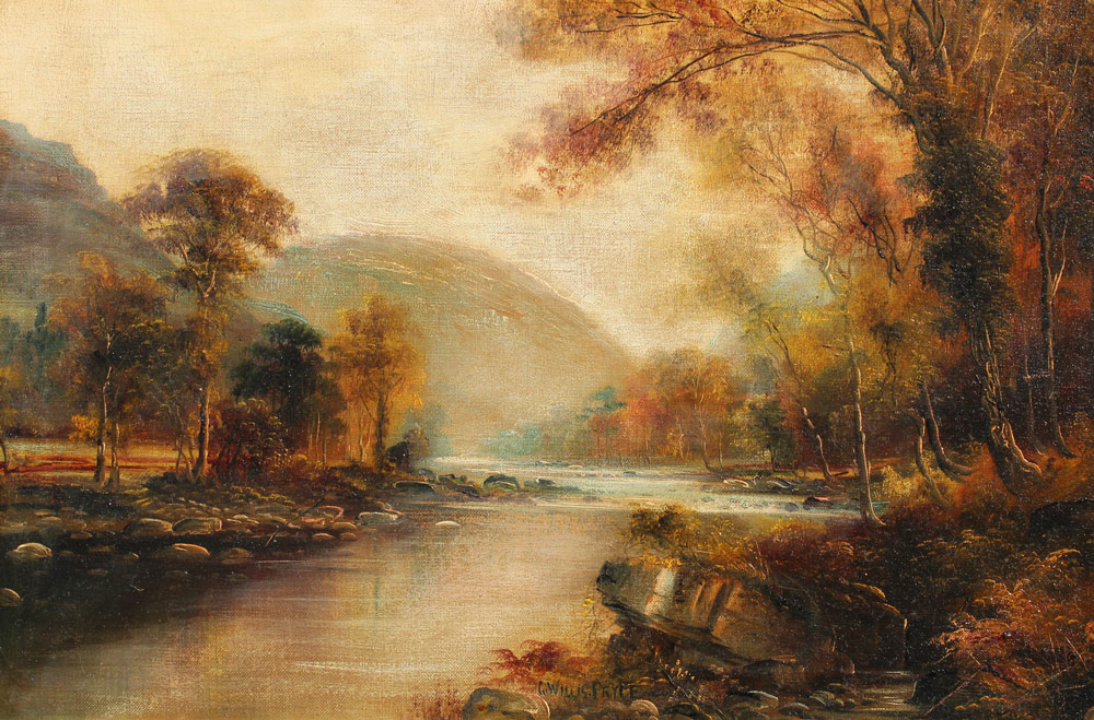 PRYCE, G. Willis, (British, 19th C.): A Stream in the Valley Landscape, OIL/Canvas, 12'' x 18'', signed mid margin, later gilded gesso frame with overpaint, 17'' x 23 1/2''.