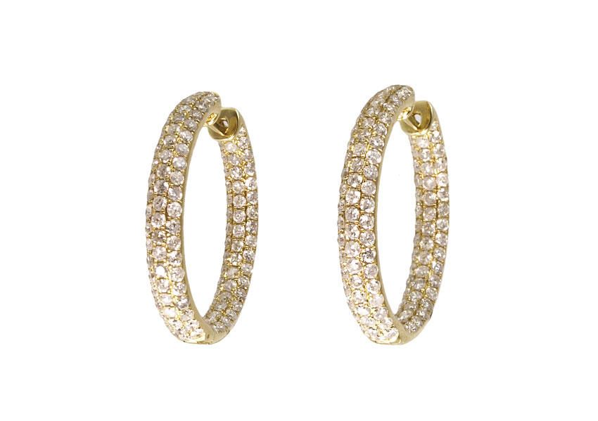 18K DIAMONDS INSIDE AND OUT HOOP EARRINGS: 18K yellow gold earrings of 226 round brilliant cut pave set diamonds totaling approx. 5.10 Ct., averaging SI in clarity and G-H-I in color. Hinged hoops with posts. Length 1.25''. Weight 12.7 grams. Sold with current Florida Diamond Appraisers GIA graduates appraisal for $10,000.