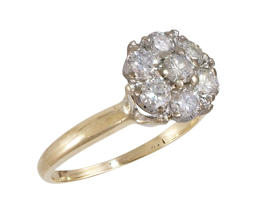 14K DIAMOND RING: 14K yellow gold ring contains 7 round brilliant cut diamonds. Weight: .85 Ct. Approx. The diamonds average VS-SI in clarity and H-I in color. The diamonds are prong set. Weight: 3.3 grams. Size: 6.5