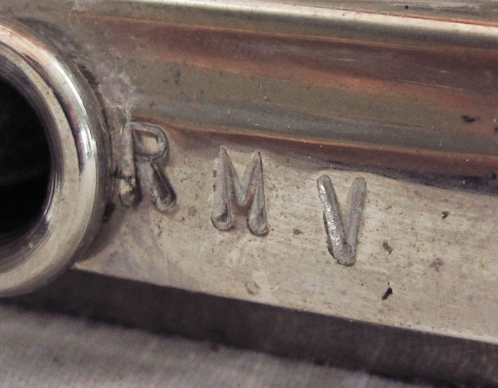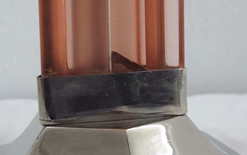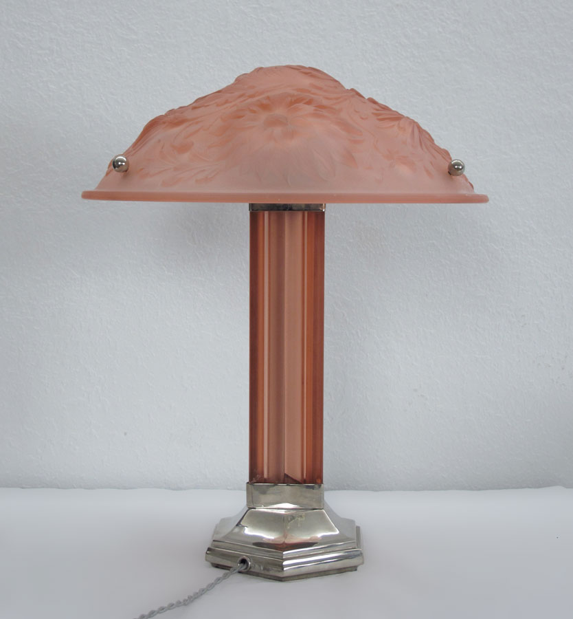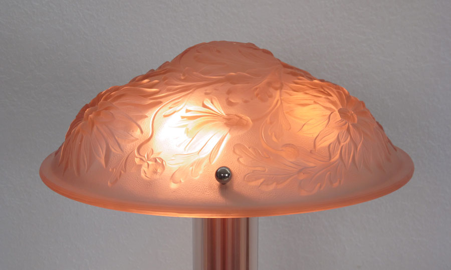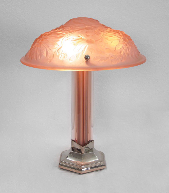 FLORAL PINK GLASS ART DECO LAMP: Frosted pink floral form molded shade, three light base with triangular pink glass body over silverplate base. Base marked RMV. Shade most likely converted from hanging lamp. Shade measures 5'' h. x 14'' dia., overall 16'' h.