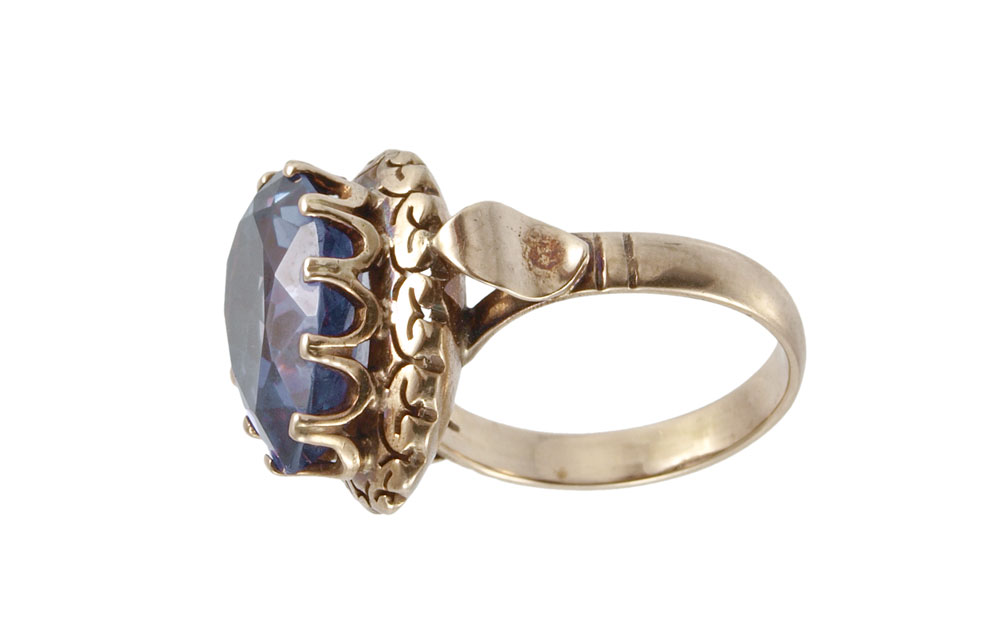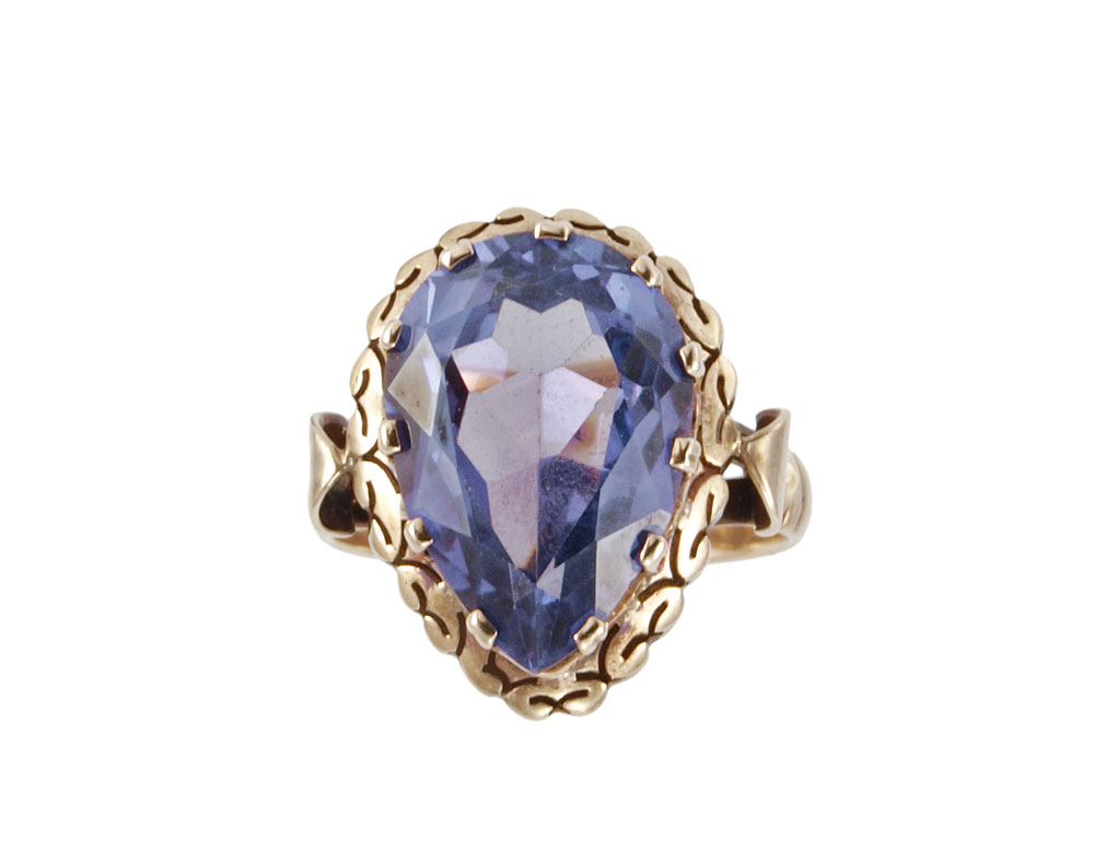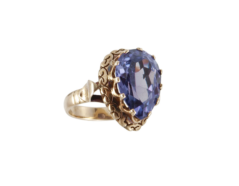 14K SYNTHETIC SAPPHIRE RING: 14K yellow gold ring contains one 15.00 x 1.00 mm pear shaped synthetic alexandrite-like sapphire. Prong set. Weight: 6.1 grams. Size: 6.5