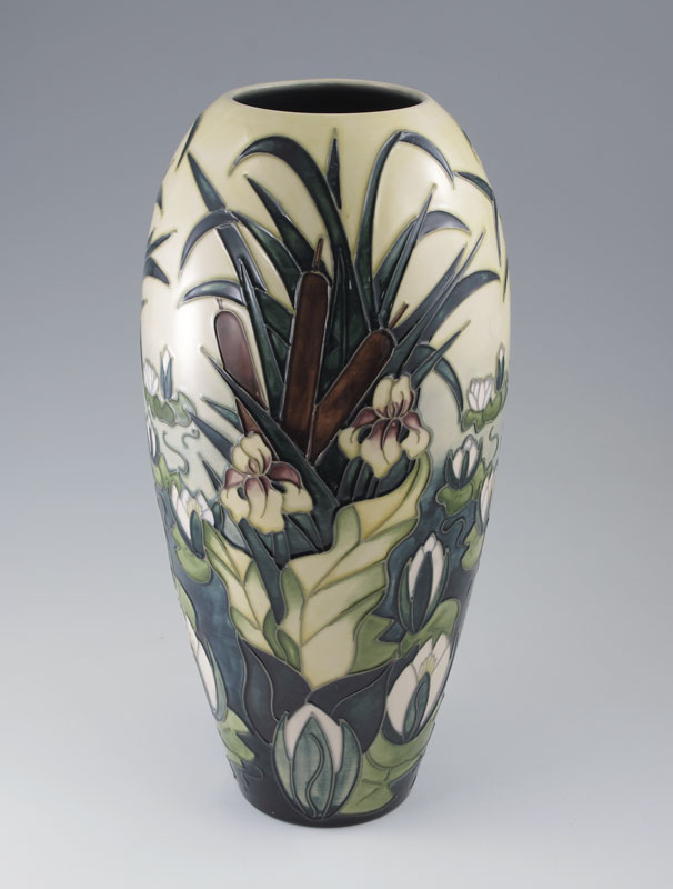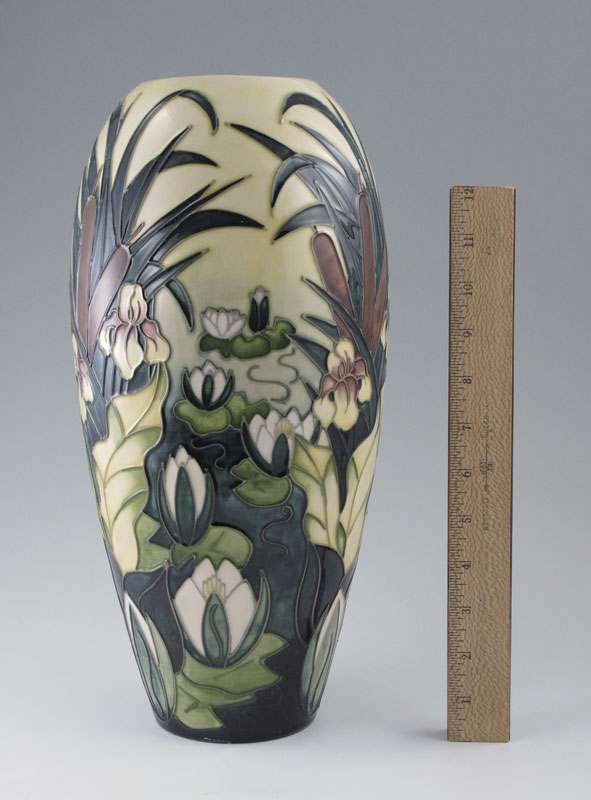 MOORCROFT LAMIA ART POTTERY VASE: Designed by Rachel Bishop in a water lily and pussy willow design. Well marked, dated 1995. Measures 14 1/2'' tall.