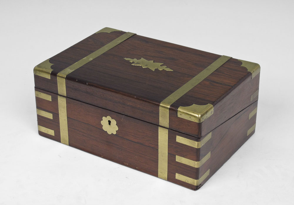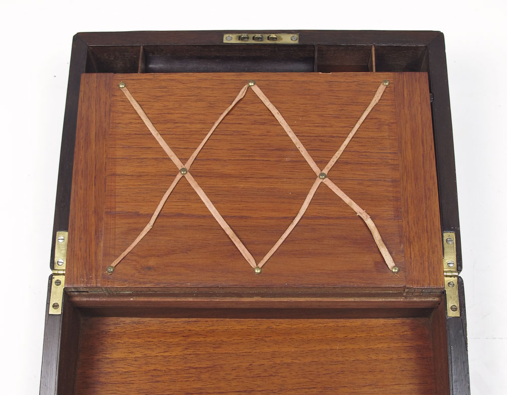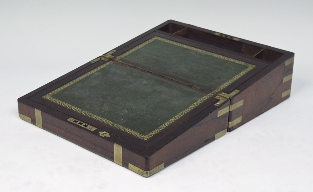 19TH CENTURY ROSEWOOD LAP DESK: Rosewood case with brass hardware and decoration. Embossed green leather writing surface, 3 compartments. Hidden compartment under writing surface. No key. 6'' h. x 14'' x 9 1/2''.