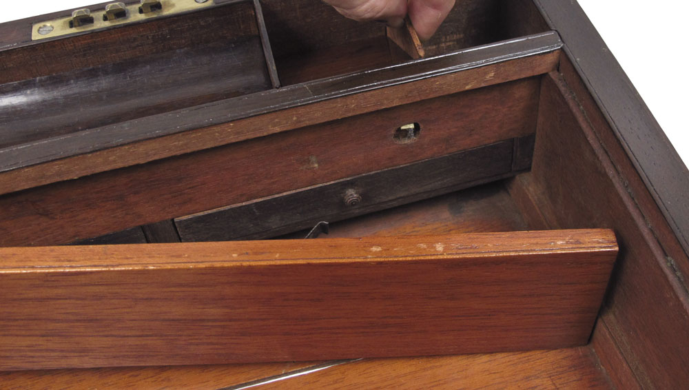 CONDITION: Note scratches to case, considerable wear to writing surface, spring not functioning on hidden drawer.