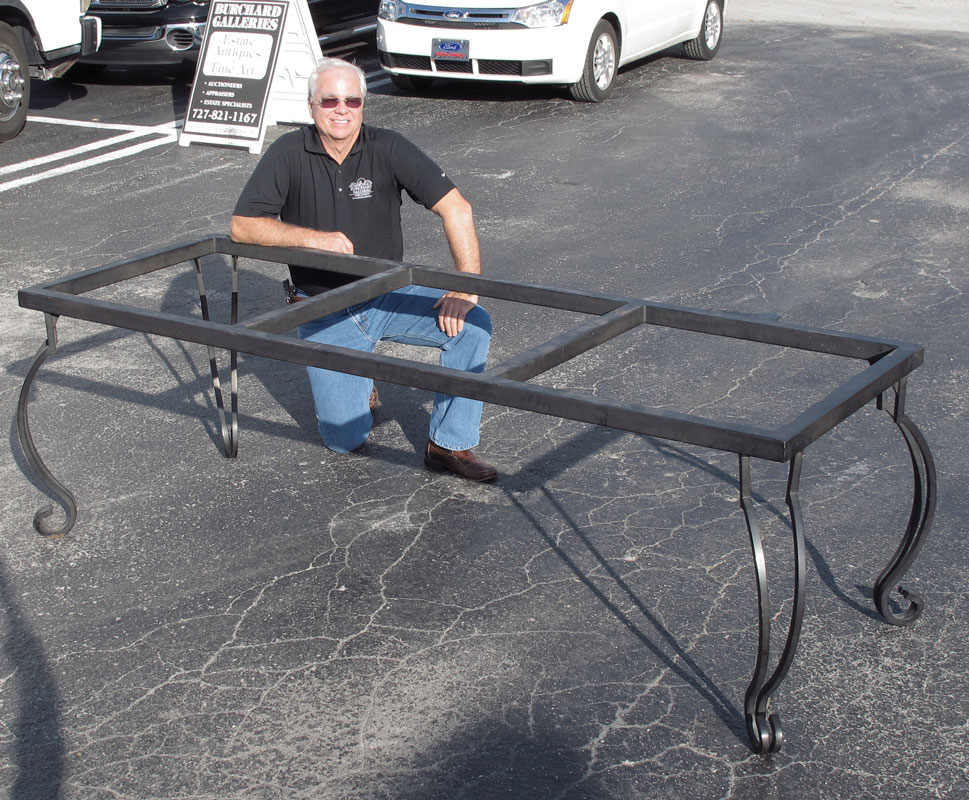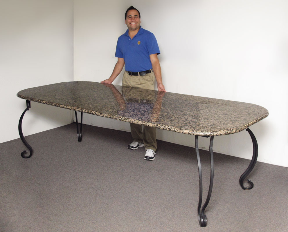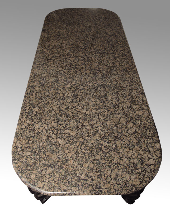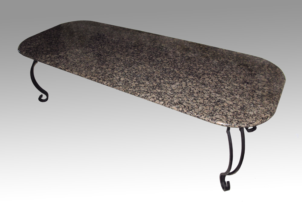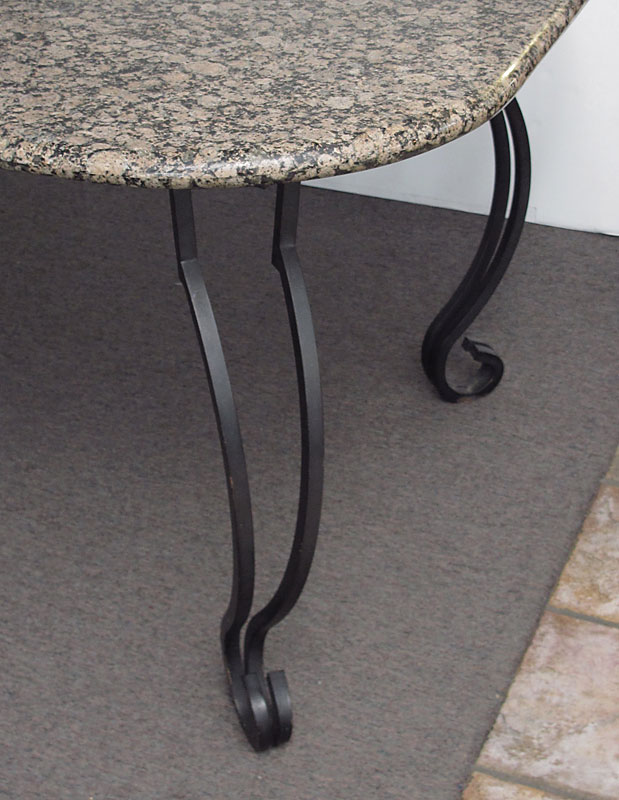 LARGE GRANITE TOP CONFERENCE TABLE: Italian granite over black iron base with shaped legs and scroll feet. 30 1/2'' h. x 106'' x 42 1/2''