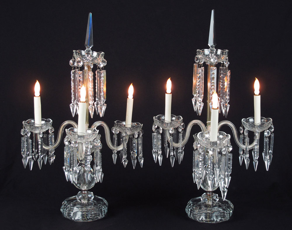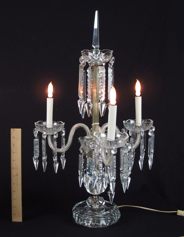 PAIR CRYSTAL TABLE TOP CHANDELIER CANDELABRA LAMPS: Three curved arm lamps dripping in prisms. 25'' tall x 16 1/2'' wide.