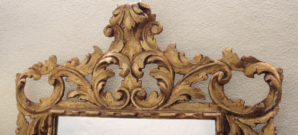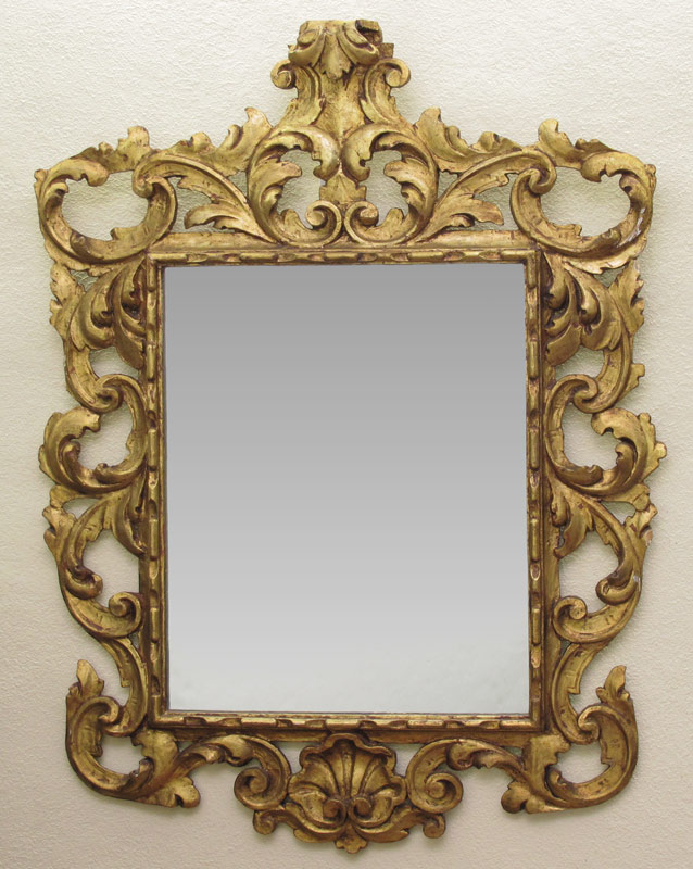 CARVED AND GILT WOOD FRAMED MIRROR: Ornate foliate scroll & shell design frame, 53'' h. x 39''.