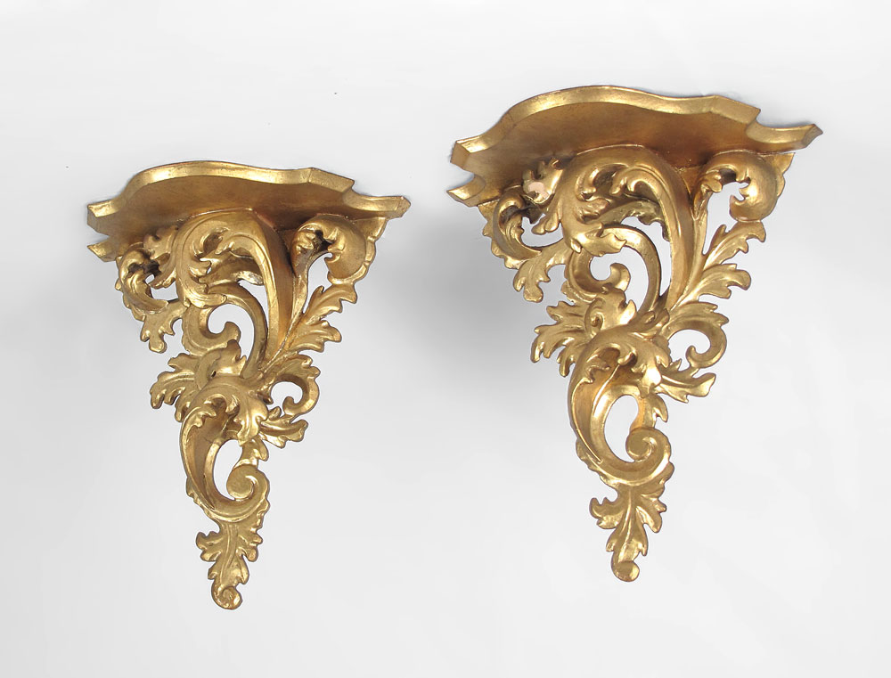 PAIR OF ITALIAN ROCOCO STYLE CARVED GILT WOOD SCONCES: Bracket shelves with plate grooves. Approx. 14'' tall x 12 3/4'' x 6''.