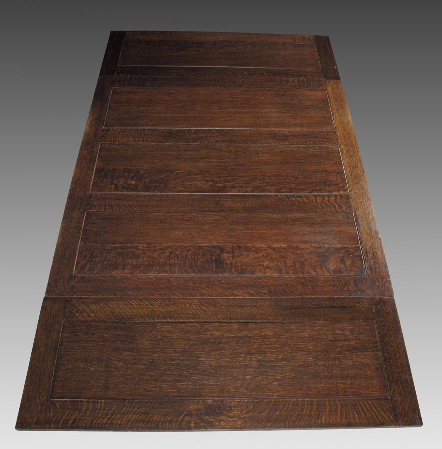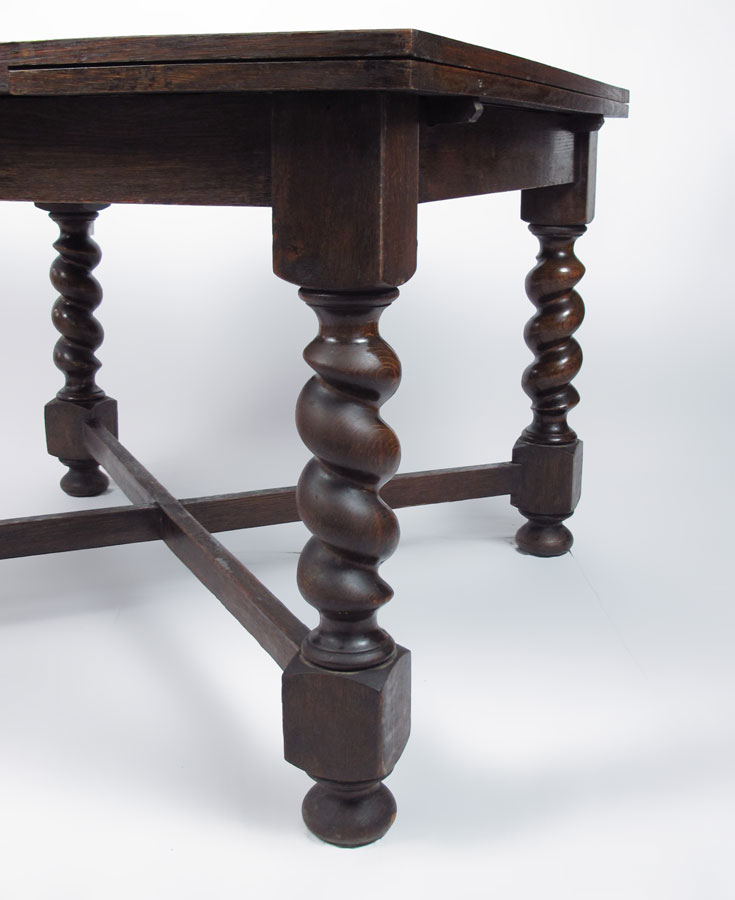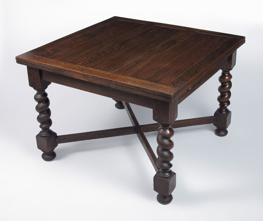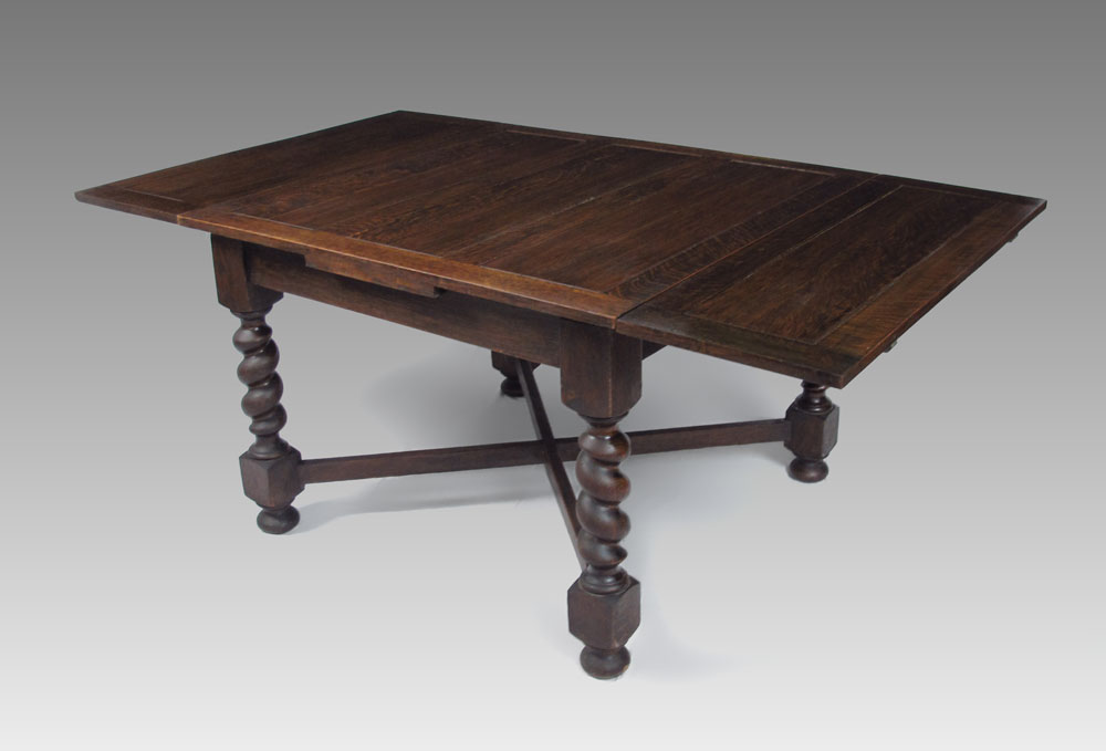 ENGLISH OAK DRAW LEAF BARLEY TWIST TABLE: Paneled top over barley twist legs with X stretcher. 29 1/2'' h. x 42'' x 42 1/2'', each leaf 15 1/4''.