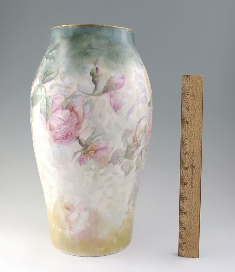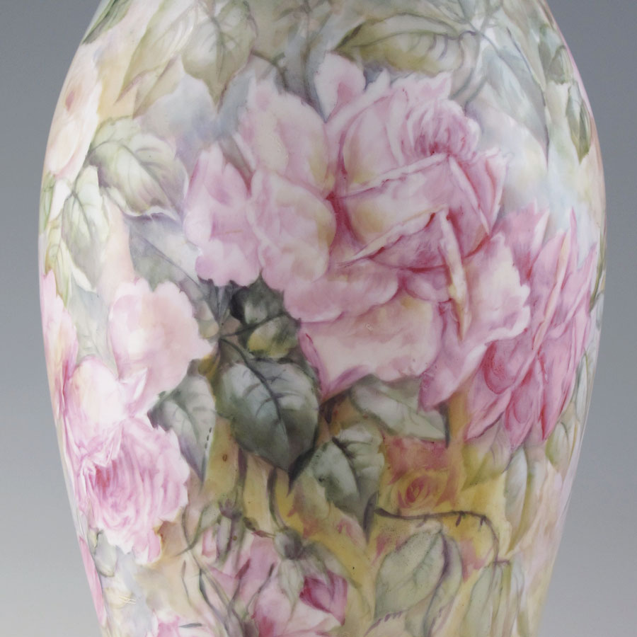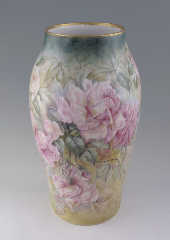 ARTIST SIGNED FRENCH LIMOGES PORCELAIN VASE: Tresseman & Vogt, Ca. 1892-1907. Handpainted in roses, signed Earl Young. 15'' tall.