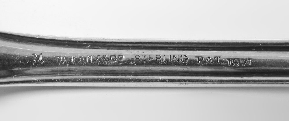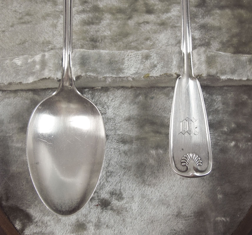 PAIR OF TIFFANY & CO. PALM STERLING SERVING SPOONS: Pair of sterling spoons in the Palm pattern by Tiffany & Co., 1871. 8 3/4'' long. Monogrammed ''M''. Approx. 4.3 troy oz. Sold with nice shadowbox frame 2 1/4'' x 15 3/4'' x 11 1/8''.