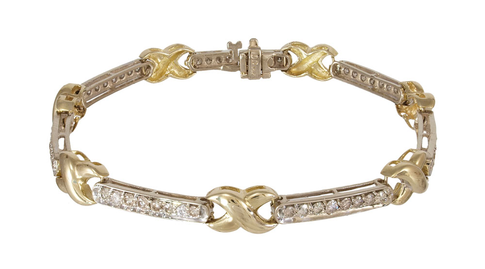 1.75 CTW DIAMOND RIBBON AND LINE BRACELET: 14K yellow and white gold bracelet contains 56 round brilliant cut diamonds. Weight: 1.75 Ct. Approx. The diamonds average VS in clarity and Top Light Brown in color. The diamonds are prong set. hidden hinged safety clasp. X and bar design. Length: 7.5'' Weight: 13.3 grams